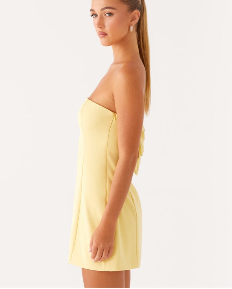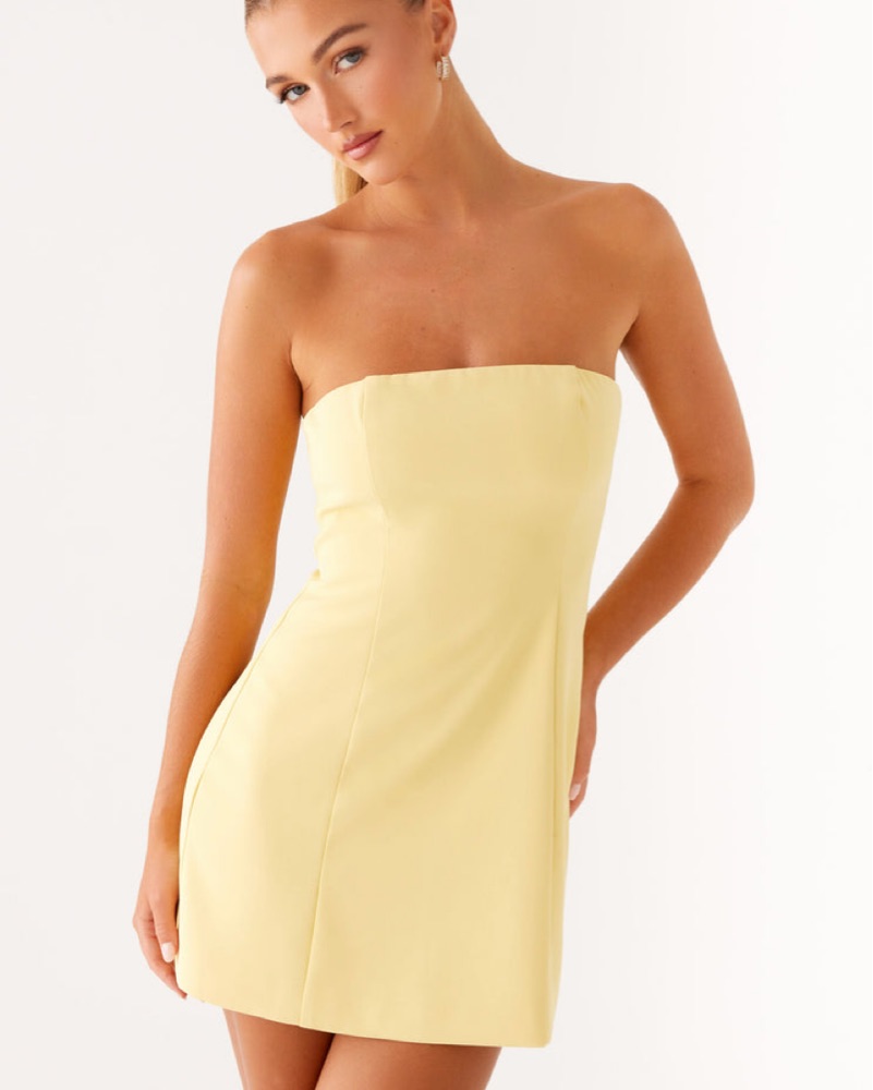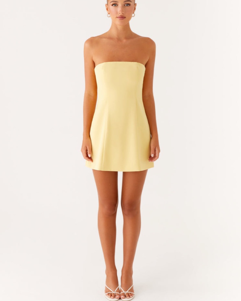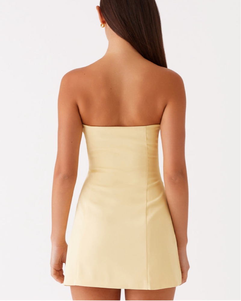 This stunning strapless dress is perfect for a summer party or night out with friends. The vibrant yellow color and fitted silhouette create a chic and feminine look.