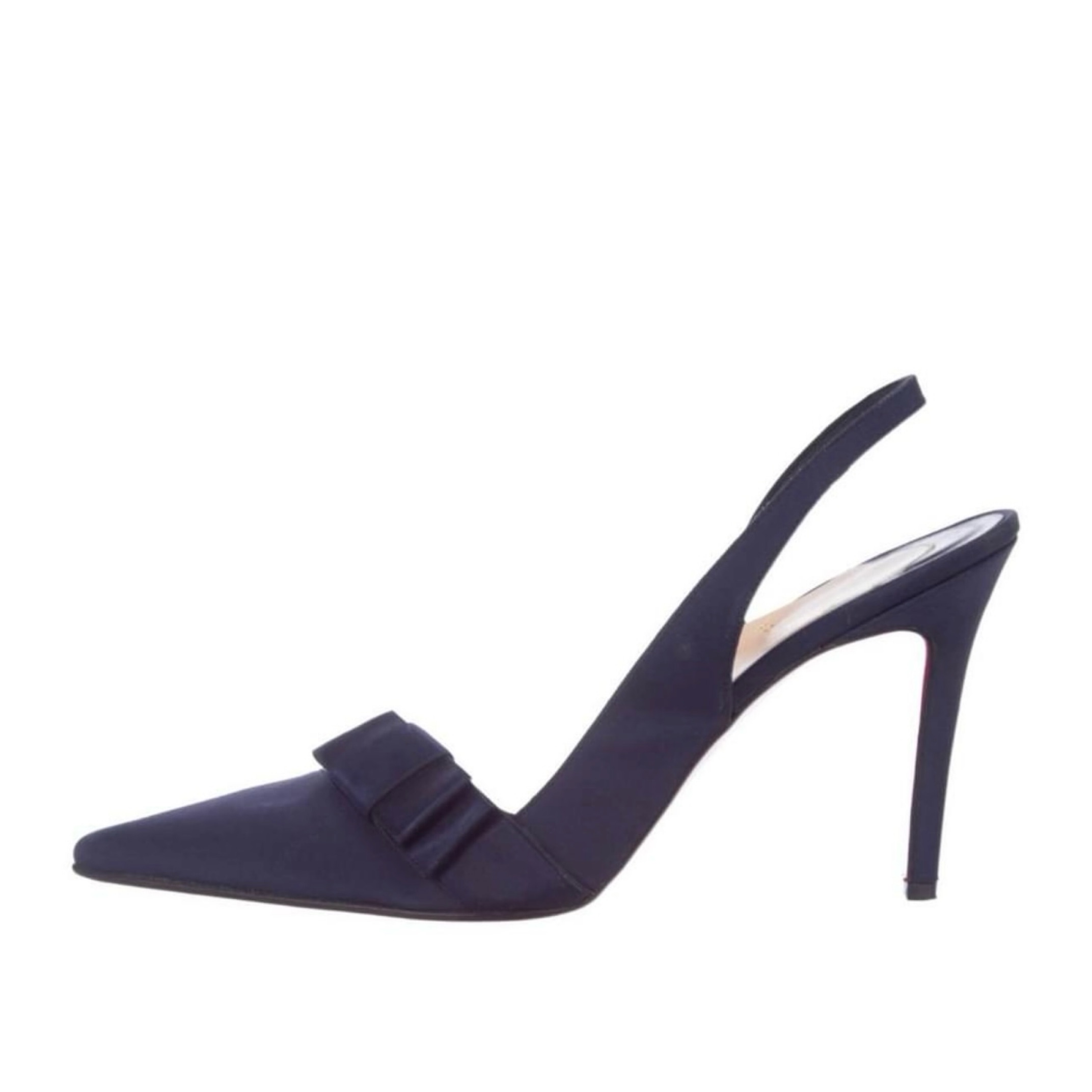 Authentic Christian Louboutin Navy Blue Canvas Slingback Pointed-Toe Pumps. Red bottom rubber sole preserver has been added to the shoe. Approx heel height 4”.