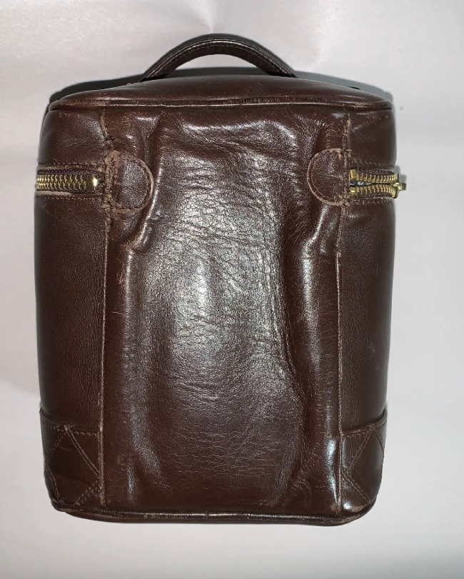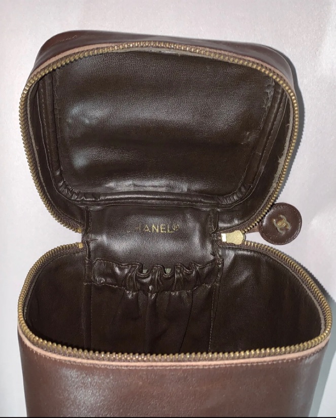 authentic CHANEL calfskin zip around vanity bag. Signature diamond quilted detail around bottom edge. Gold tone metal hardware. Includes original signature CHANEL CC logo lozenge at zipper pull. Bag is in overall, VERY GOOD VINTAGE CONDITION. Light scuffs and scratches from normal use, back