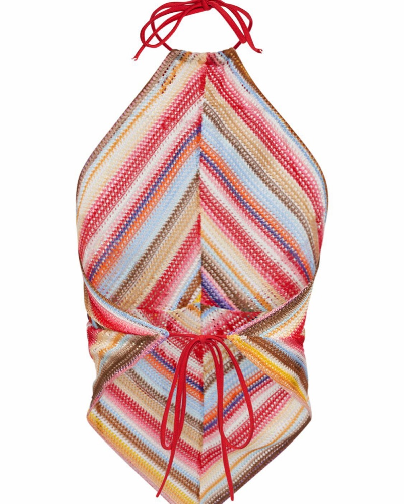MISSONI MARE SET, available for rent and or purchase. Striped sexy crochet knit halterneck top (590$) slim shape, multicolor, ties at the back for an adjustable fit. Long flare crochet loose pant (1,100$) fits S/M.