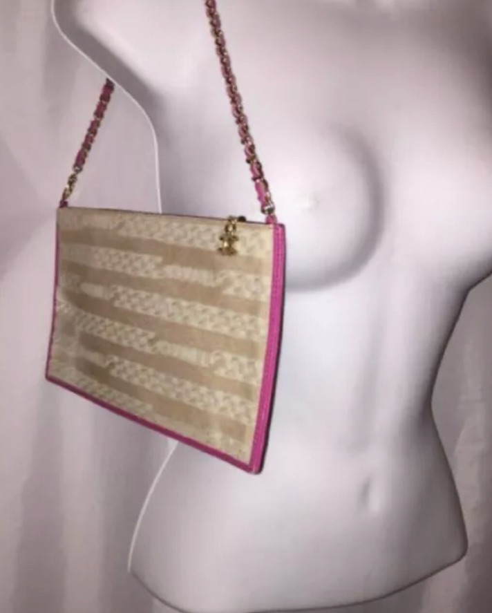 gorgeous vintage pony hide and leather evening bag with carved chainlink motiff and goldtone signature hardware. From Fall 2001 Collection. Piece has serial number and hologram intact in lower interior corner. Light wear at corner edges. EXCELLENT VINTAGE CONDITION.