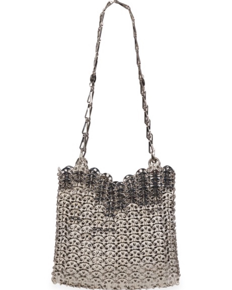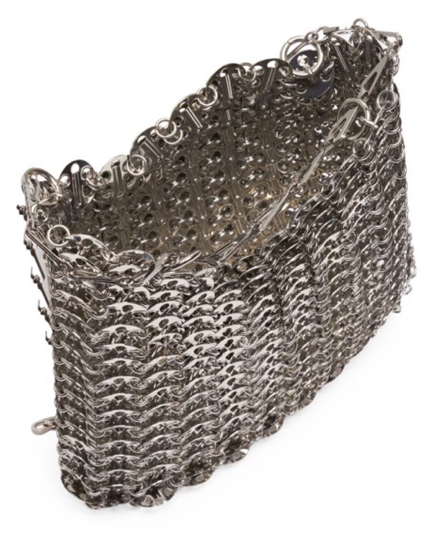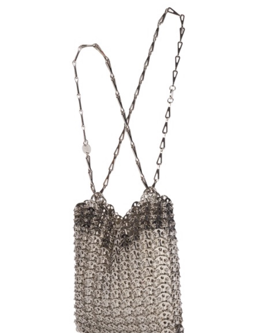 Paco Rabanne's 1969 chainmail shoulder bag is formed of polished metal paillettes arranged in lightweight, articulated rows.