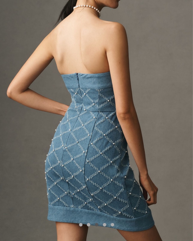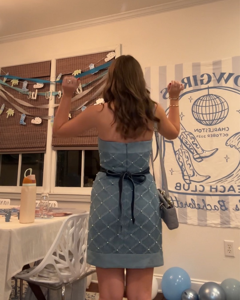This glamorous strapless dress is perfect for a night out on the town. The sparkling sequin details add a touch of elegance, making it a great choice for a special occasion. Perfect for a bachelorette trip with a denim themed night.