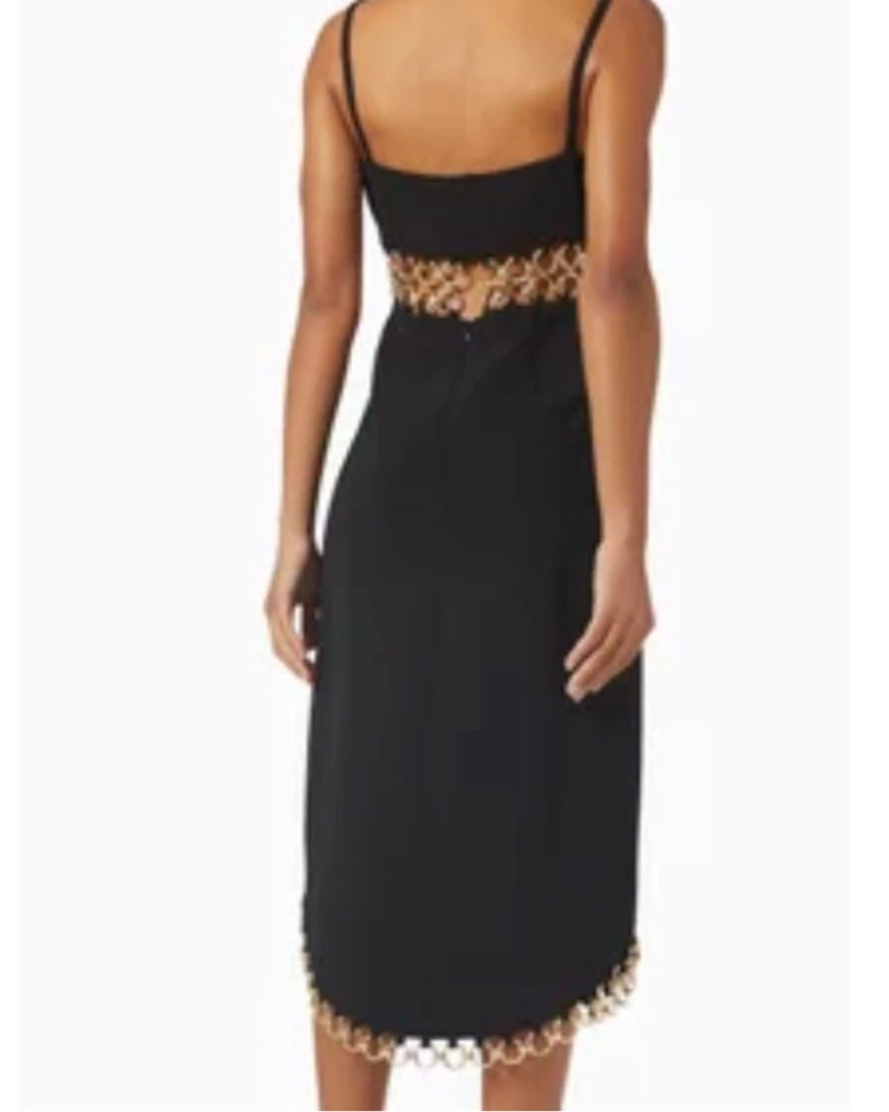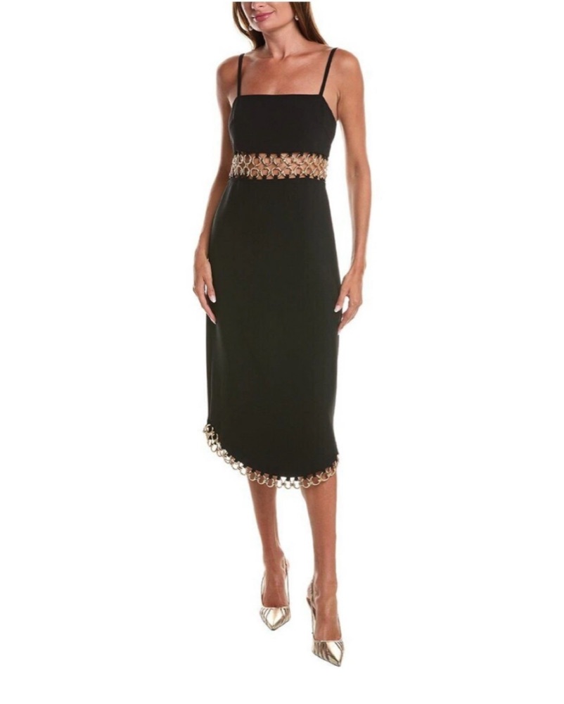 This stunning black midi dress is perfect for a formal event or special occasion. The metallic trim at the waist adds a touch of glamour to the sleek silhouette.