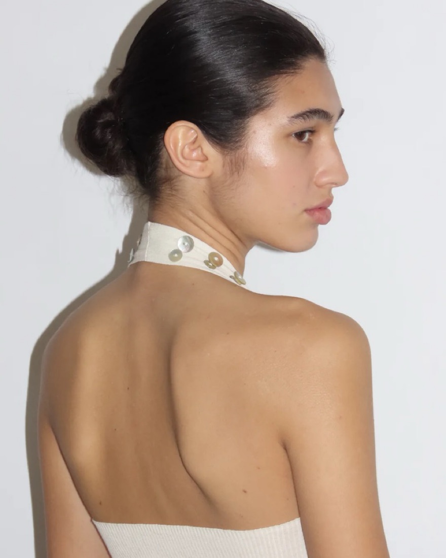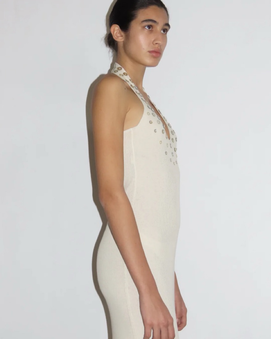 Lightweight cotton halter dress with a flared hem. Neckline adorned with hand-sewn mother-of-pearl buttons. Color ecru.
