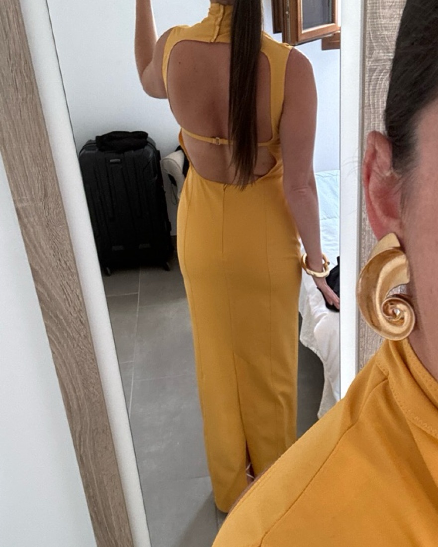 Fits sz 4/6 US. Cut out front, mock turtleneck cut w an open back clasp closure. I’m 5’5 and the heels were no more than 2” in this photo to give you an idea on length. Dress has been worn once to a wedding- like new!