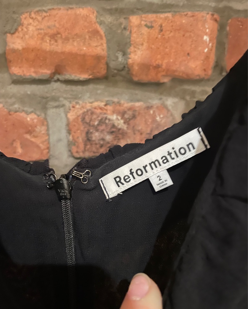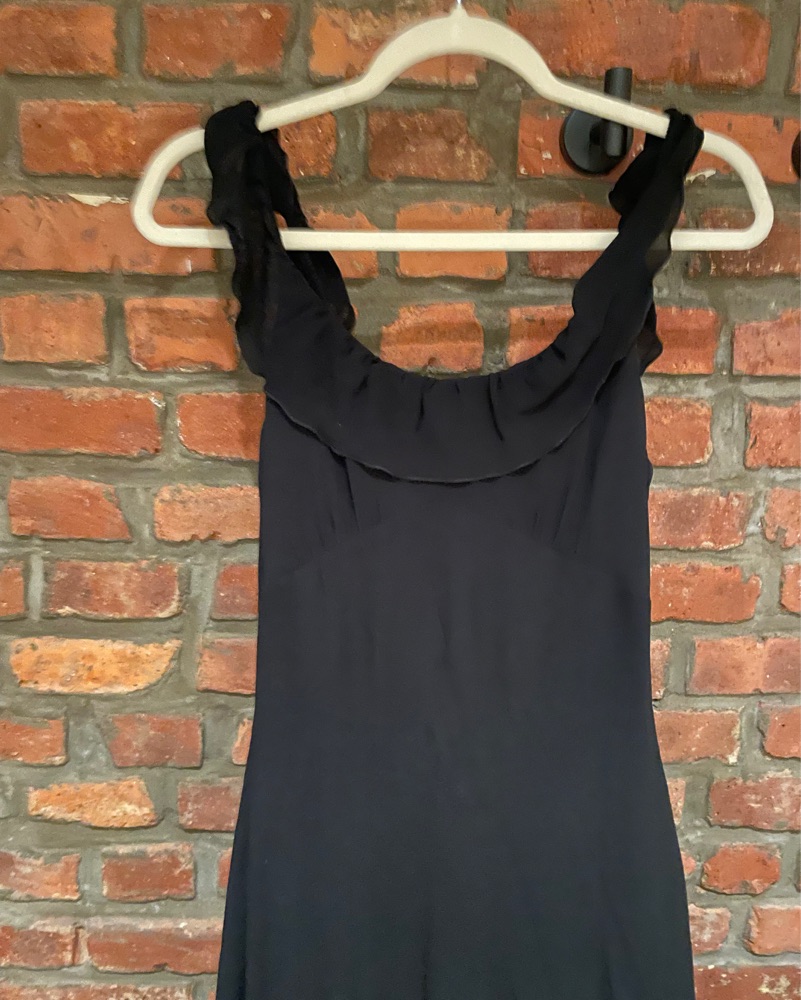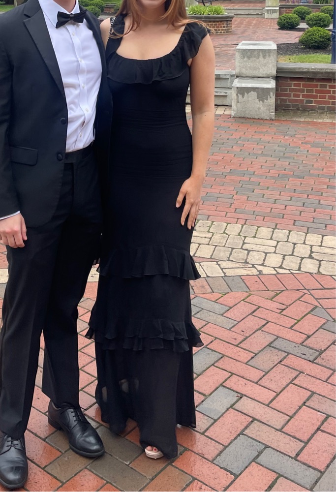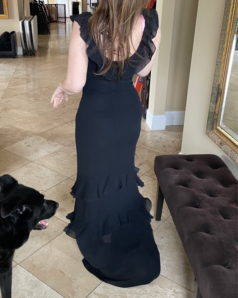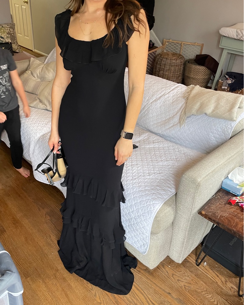 Black tie, floor length Reformation gown with ruffle detail