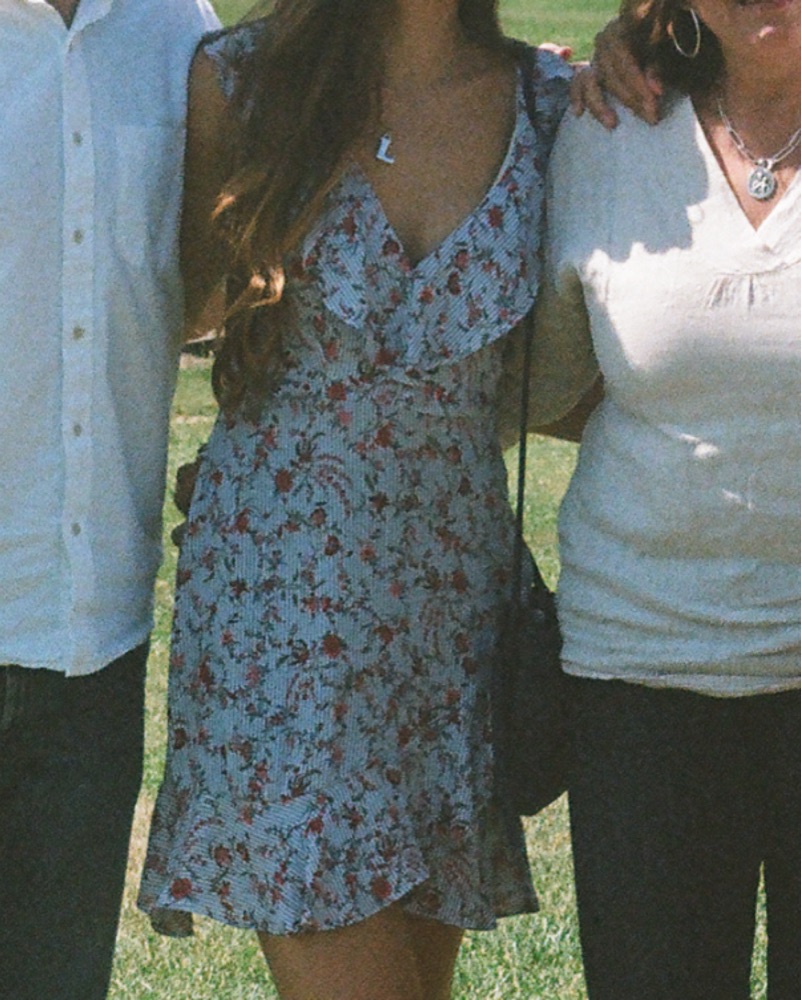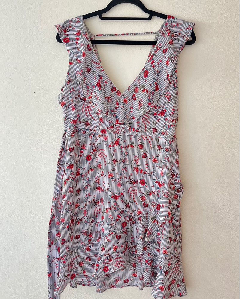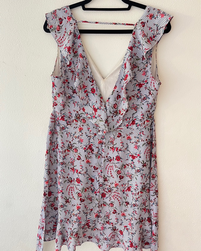 Vibrant floral print and a flirty, ruffled neckline and back. Perfect for summer.