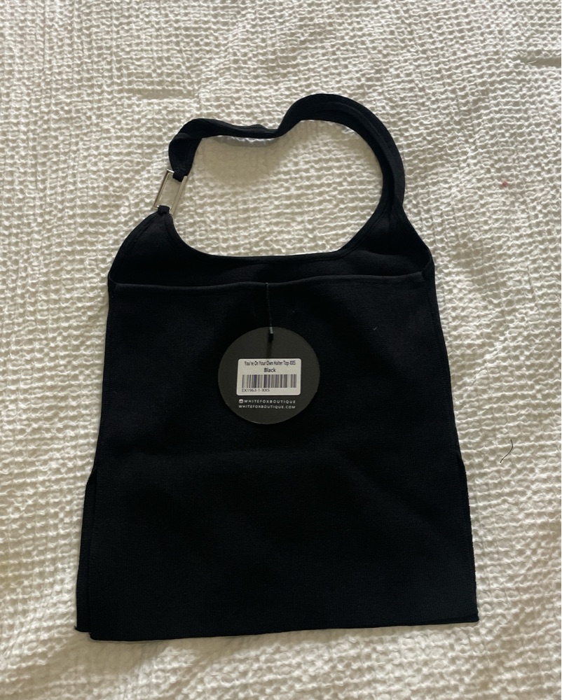 a halter neck style with silver hardware embellishment, ribbed material, side split detailing, unlined and stretch material for an easy slip on design.