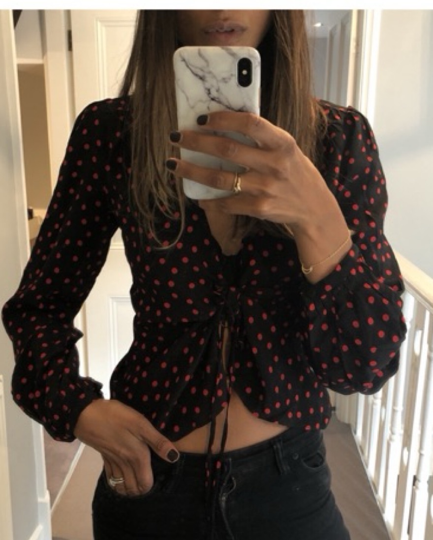 Polka Dot tie top from Realisation Par — I have the sleeves hemmed so that they flare out and don’t have a button