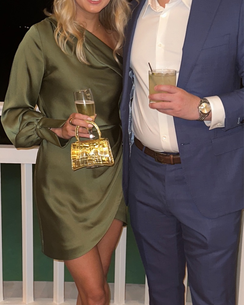 This stunning olive-green mini dress is perfect for a night out. The one-shoulder design and flared sleeves add a touch of drama, while the shorter hemline shows off your legs.