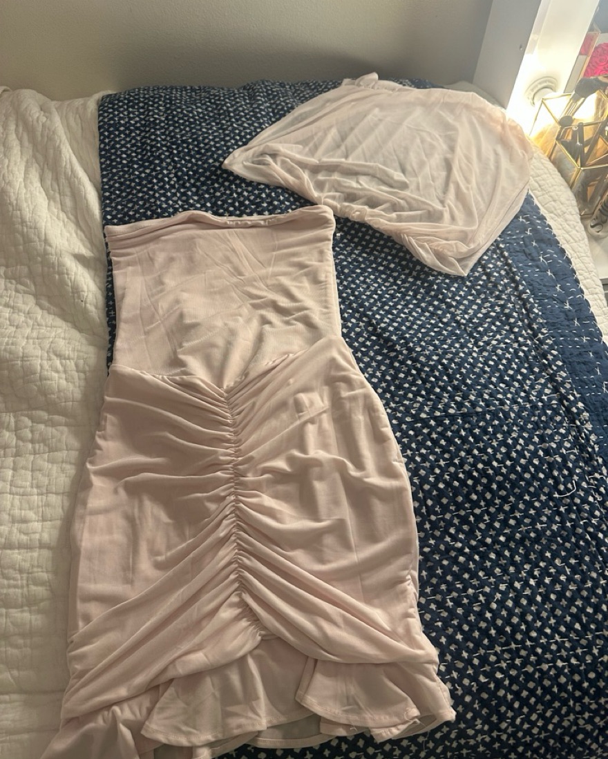 Pale pink with a ruched back. So flattering. The shawl is separate from the dress