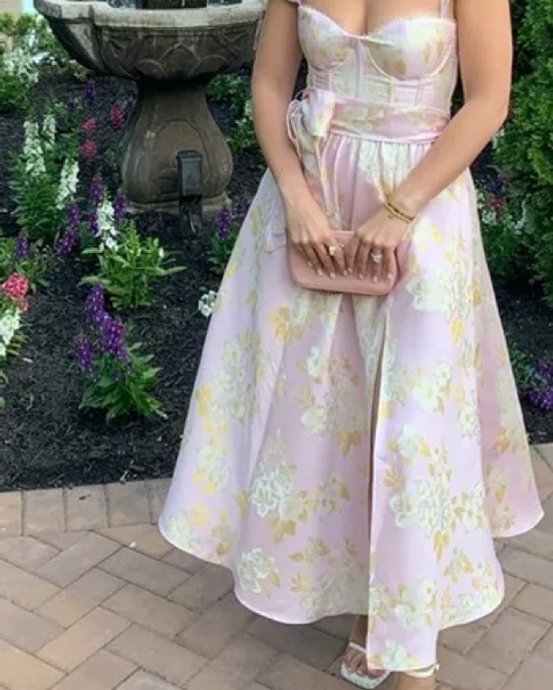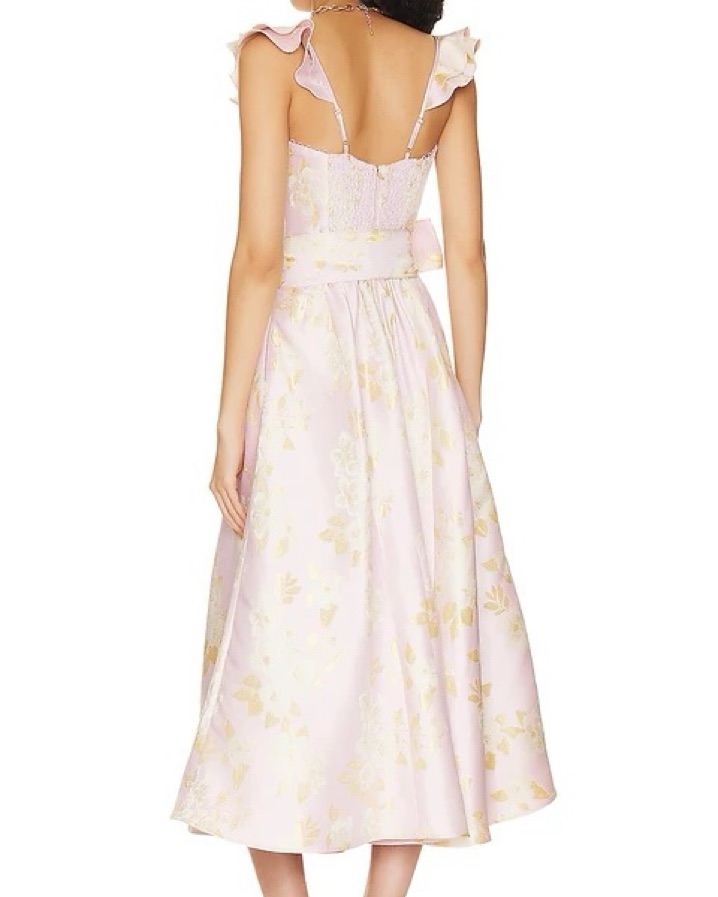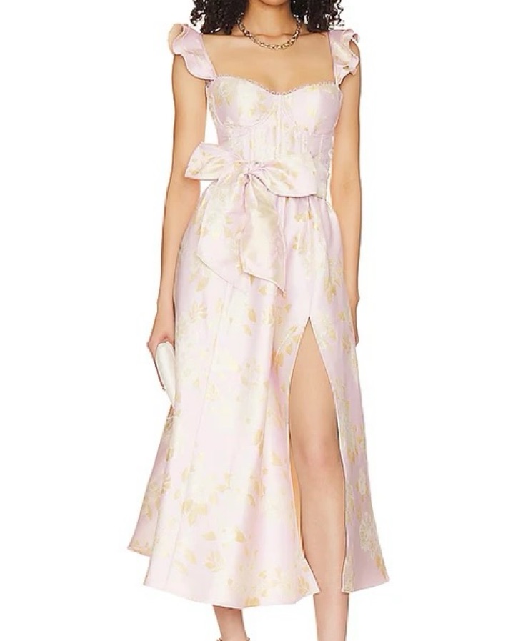 Fits size 8/10. The Vera Dress is an ankle length corset dress featuring a side front slit and bow-tie belt. She's made in our romantic Light Lilac Baroque Floral brocade and adorned with dainty loop trim and the sweetest ruffle details. She's classic, sophisticated, and ready for evenings out!