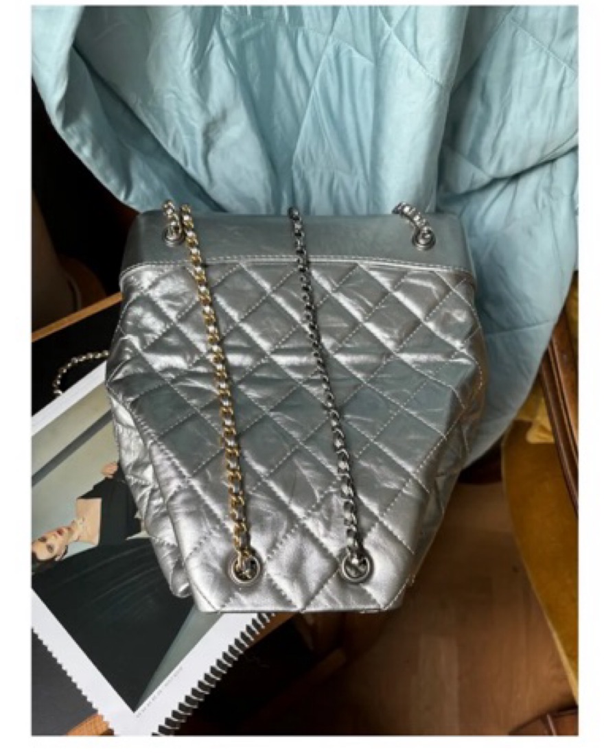 Chanel Gabrielle backpack in metallic silver leather and multi-colored gold chrome chain. In a very good condition, with minor signs of wear.