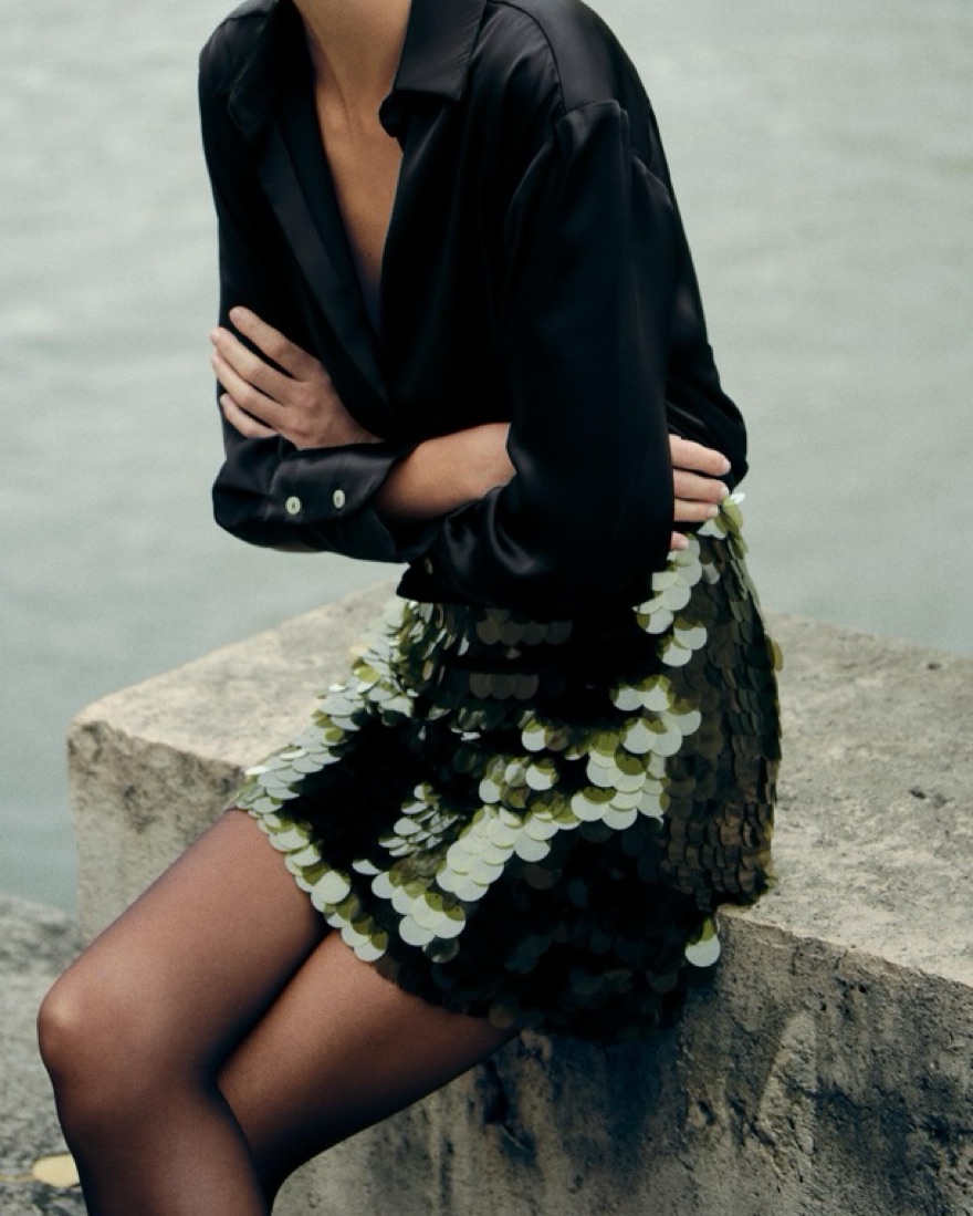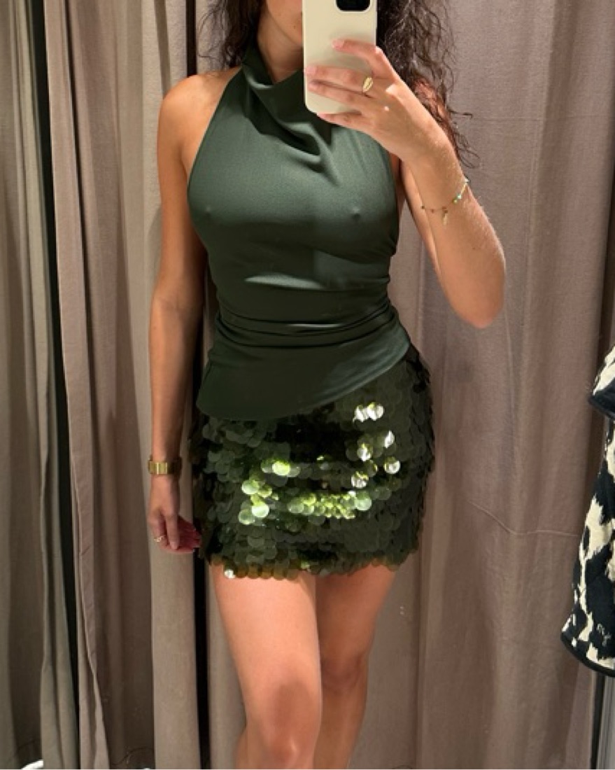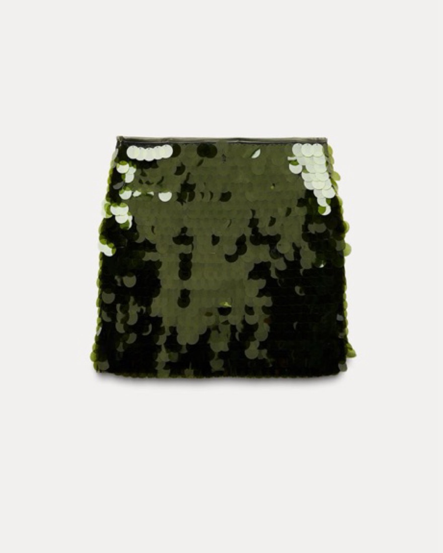 Zara short sequined knit skirt, green. Mid rise. Hidden zip closure at side. Such a cute skirt. Never worn, new with tags! I have the matching green halter top seen here also, size small — message me if interested in renting both pieces