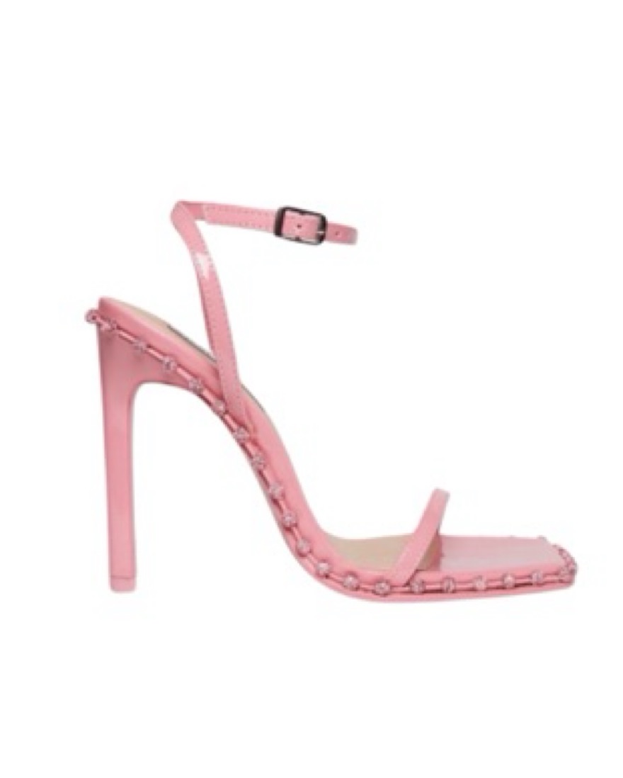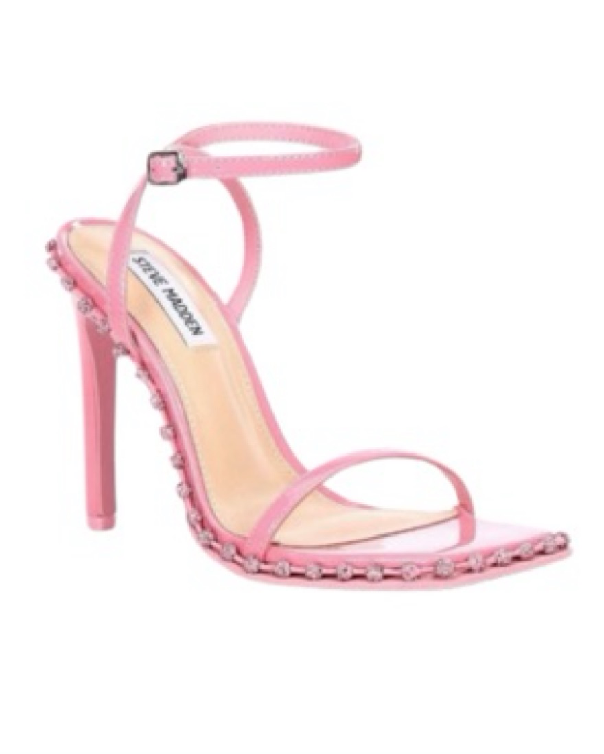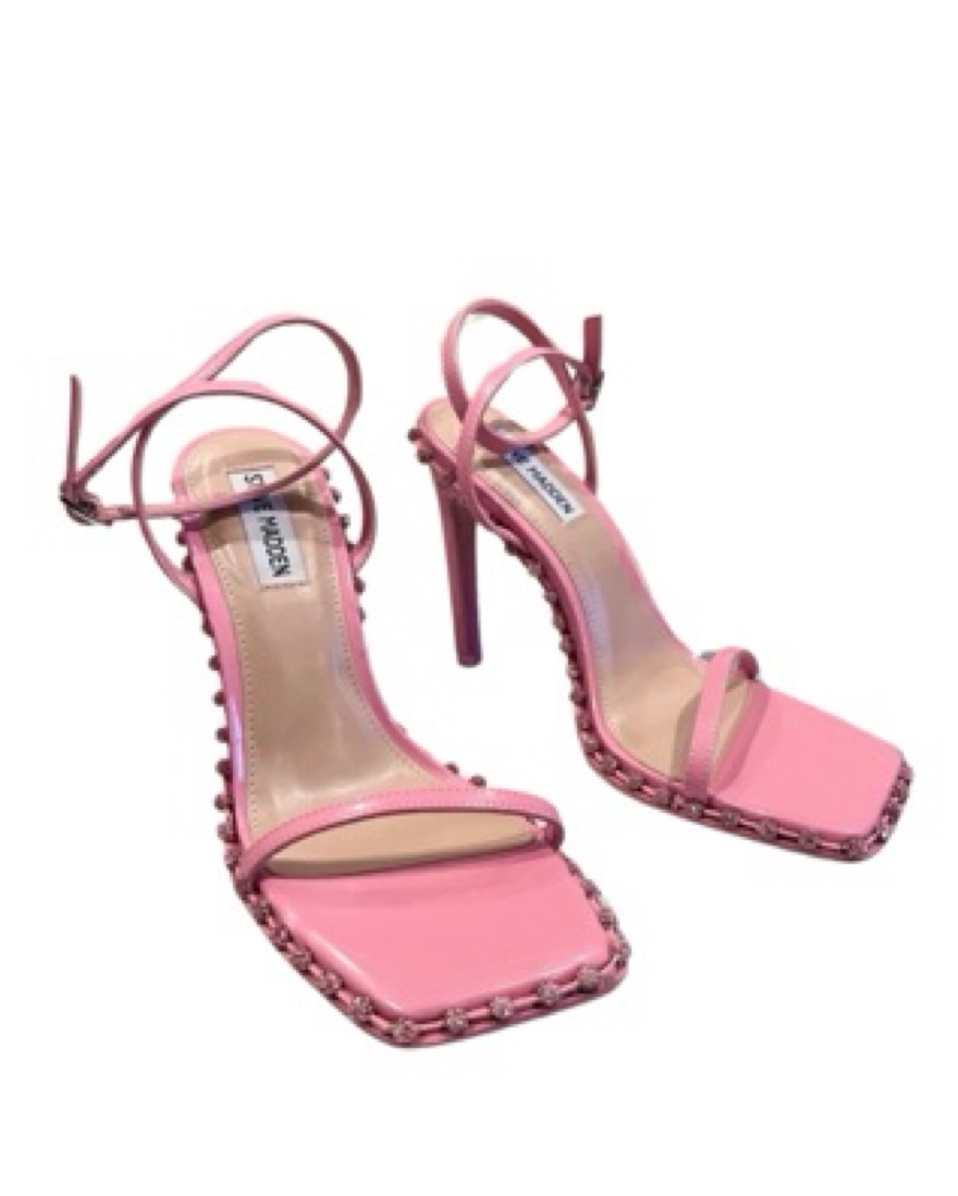 Pink rhinestone embellished “Zelle” heels from Steve Madden with ankle strap closure. US Women’s 7. Definitely a photo/sitting shoe as not the most comfy if you’re gonna be standing or walking.