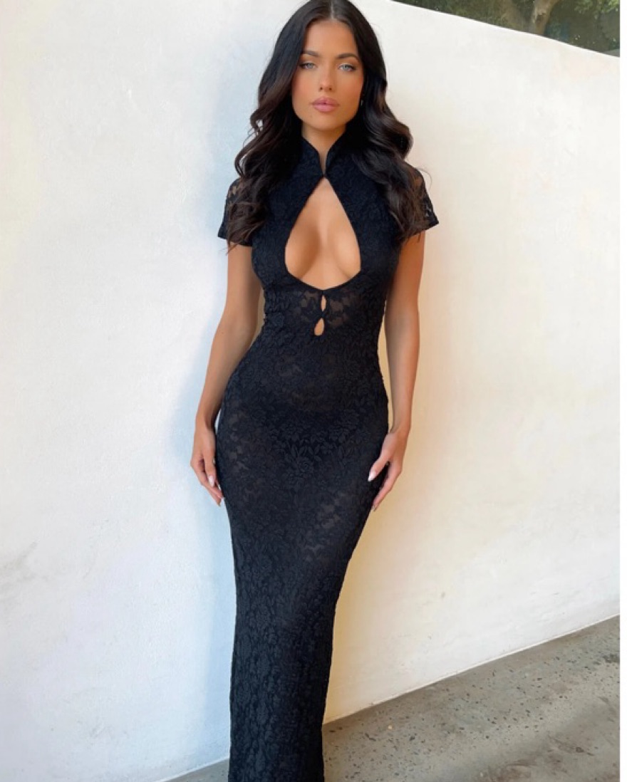 Lace black maxi from outcast. So many compliments when i wear it. Makes the girls sit pretttyyyy! The back is a laced up cutout. Fabric on body is pretty see through. Perfect for a night out or a date. Not very long can fit petit girls with heels