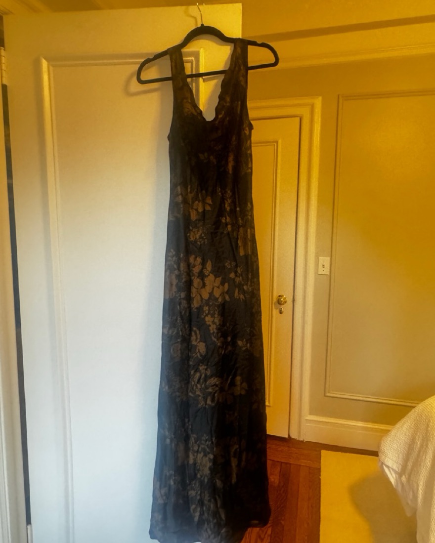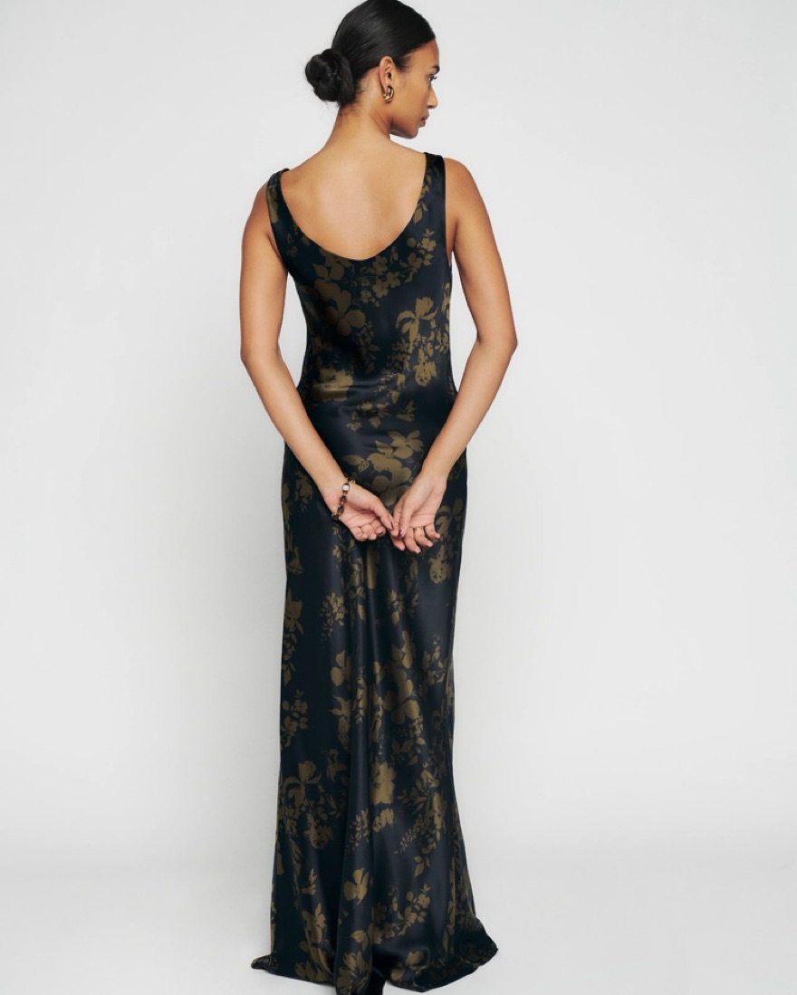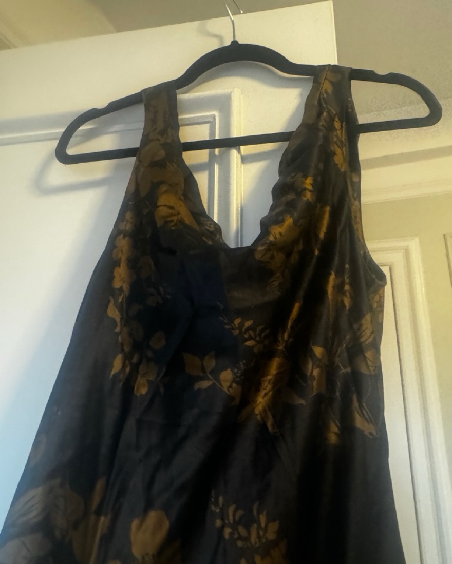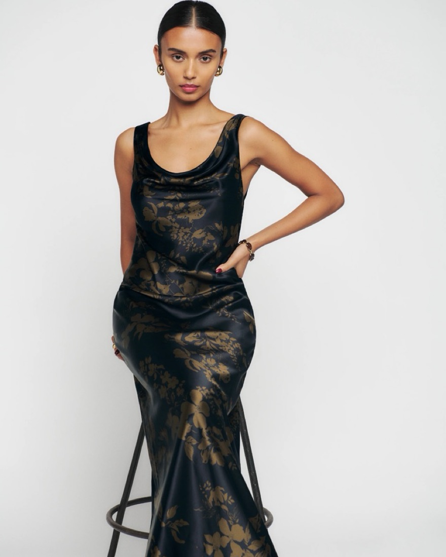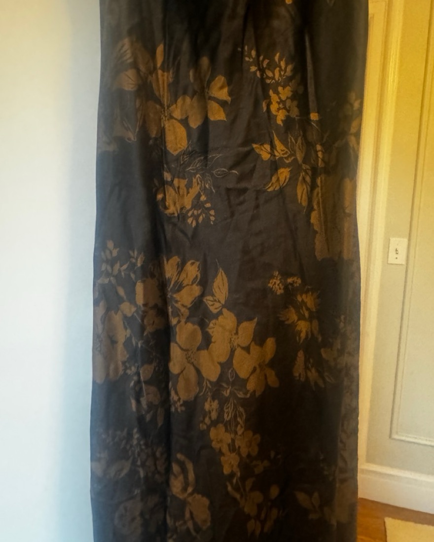 Beautiful Reformation Annabelle Silk Dress in black / gold (called Night Garden on Reformation site). Dry cleaning required prior to return.