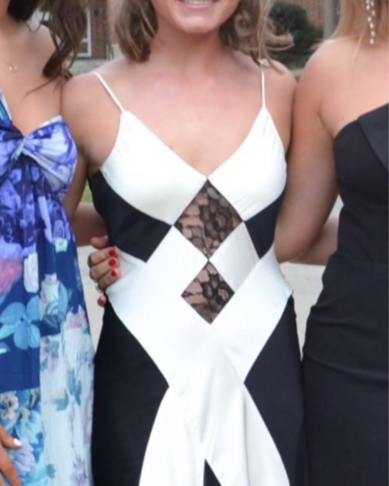 My most prized possession. Silk long gown with lace in the front. One or two stains at the very bottom of the dress on the white fabric from being worn and touching the ground, but not noticeable whatsoever when it’s being worn.
