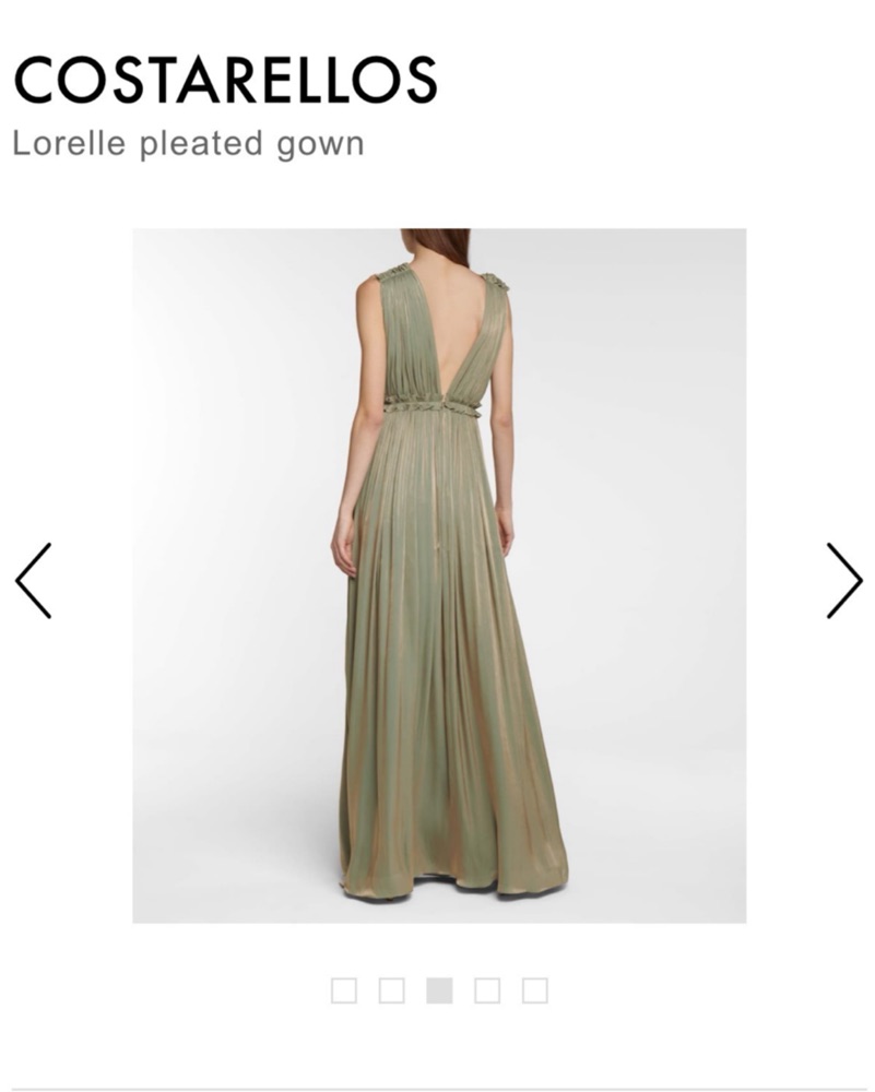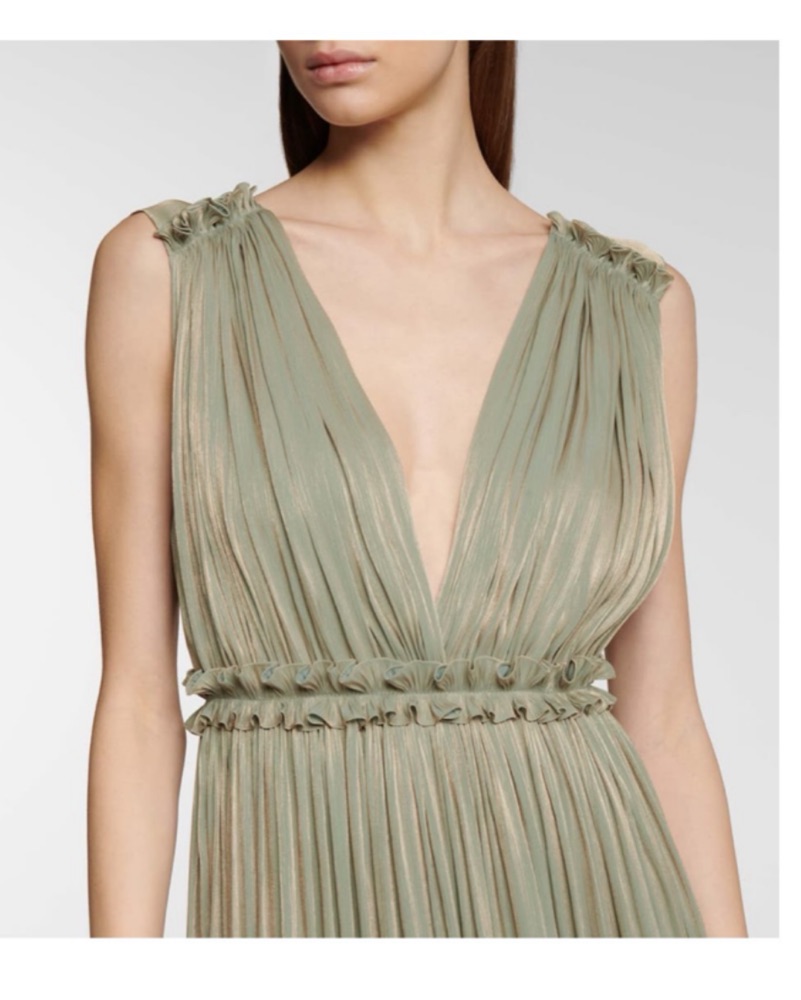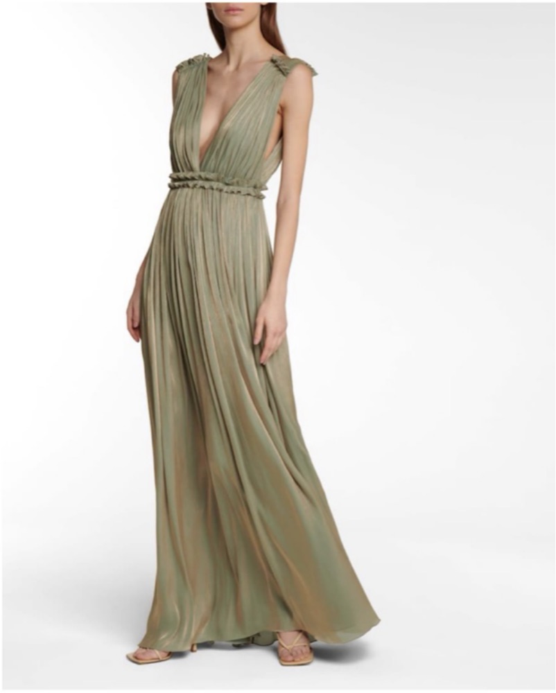 Green pleated gown with highlights of gold. Perfect for a bridesmaid dress and weddings!