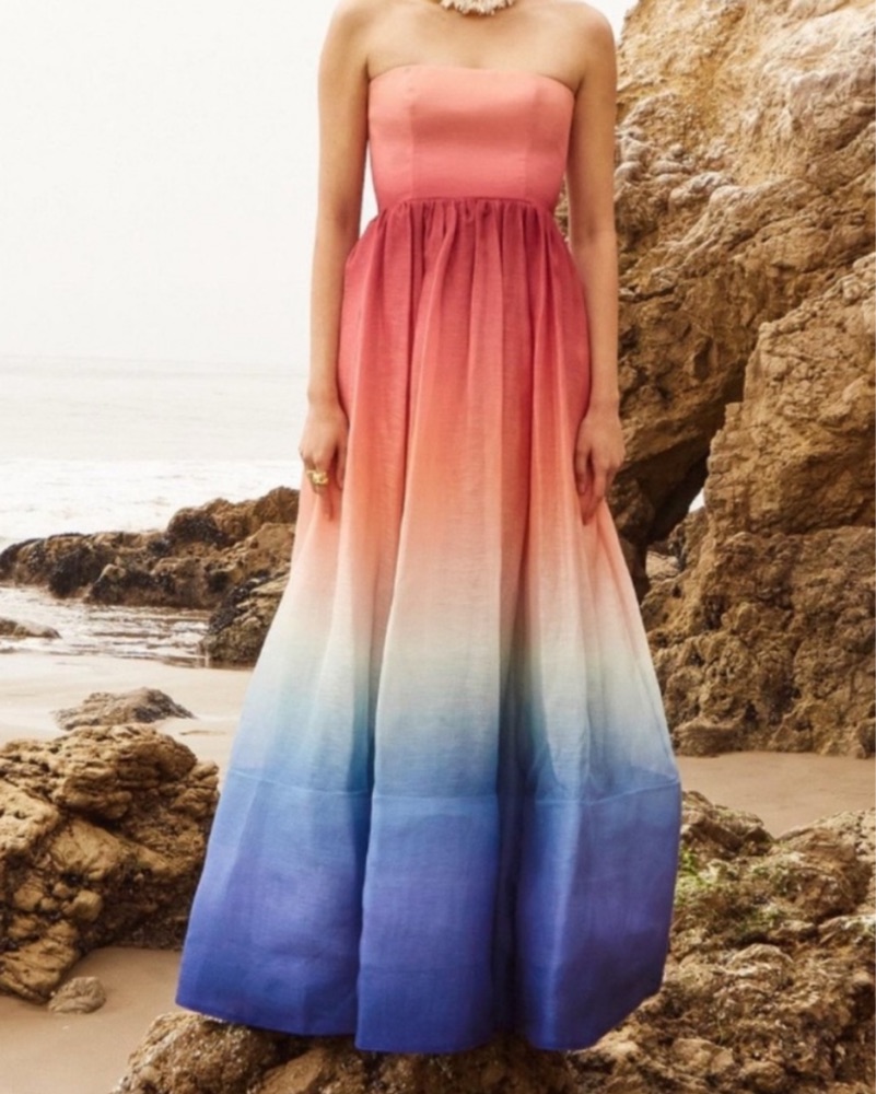 Zimmermann's 'Postcard' ombre maxi dress from the 2022 collection is made from a luxurious blend of linen and silk. Cut slim in the bodice, this style talls to a voluminous gathered skirt.