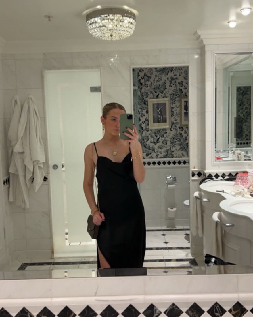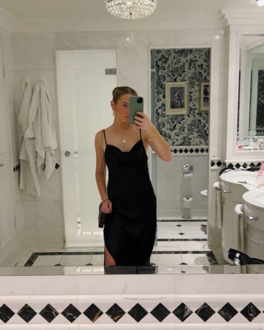 This sophisticated black maxi dress is perfect for a formal event or special occasion. The sleek silhouette and thigh-high slit create a stunning, elegant look.