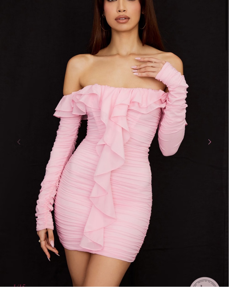 This dress is so cute and unique. I love the off the shoulder style and the baby pink is the cutest color. Size small and worn once!