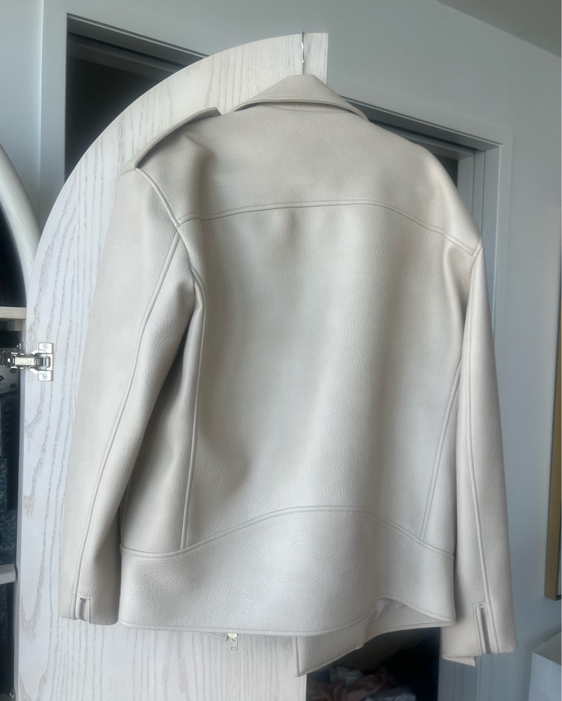 Great condition. I don’t see a size on this jacket. It’s very oversized. I’m a small medium but again oversized. It’s a very light beige color