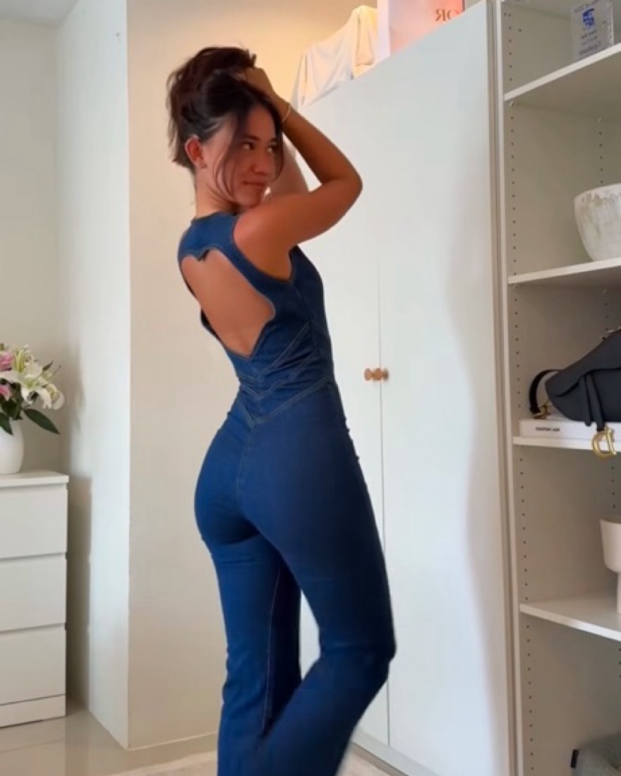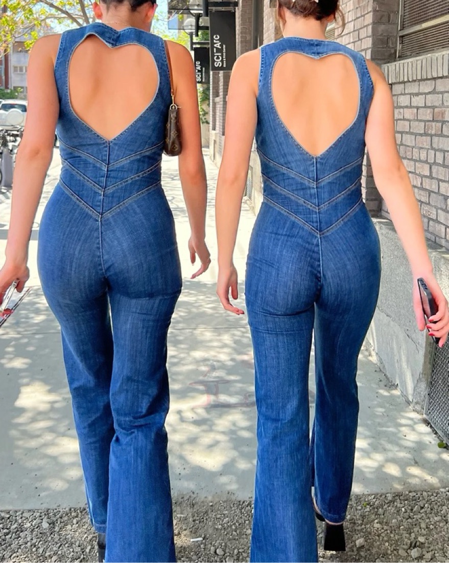 This stylish denim jumpsuit features a unique heart-shaped back design.