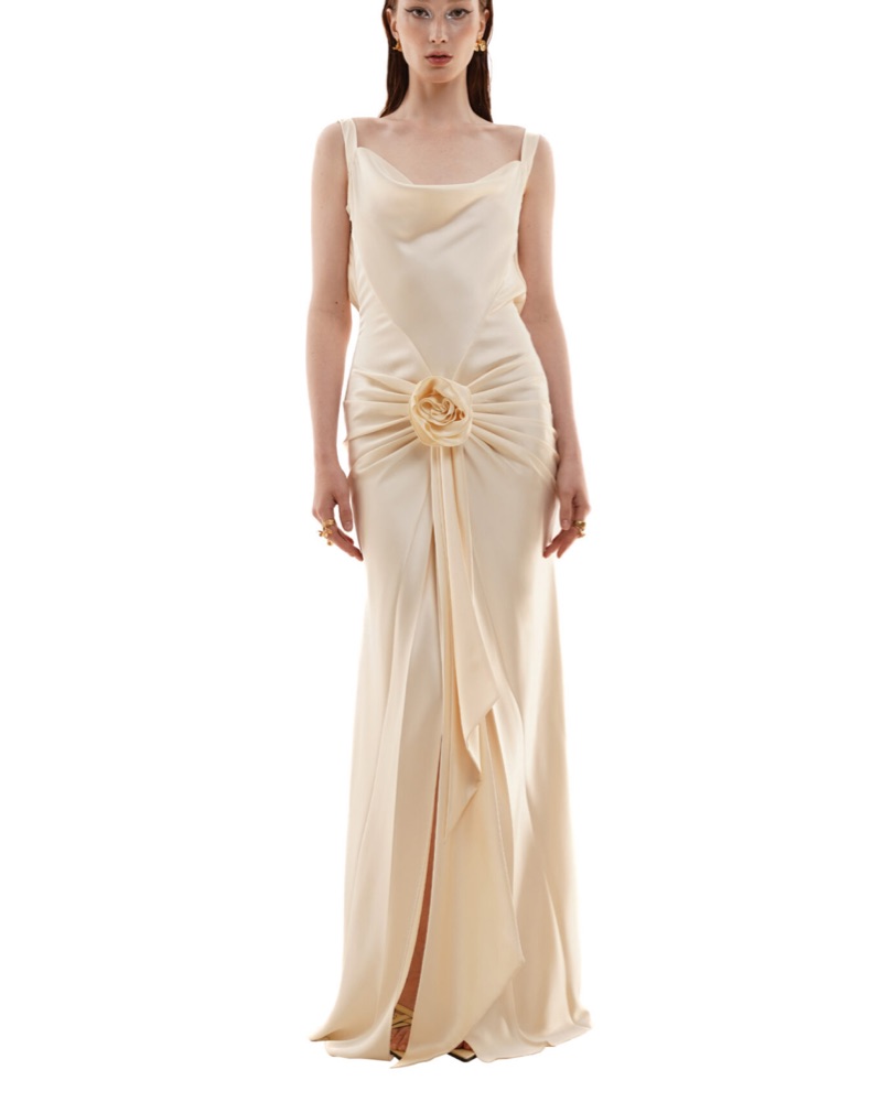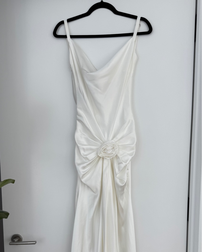 This stunning silk gown is perfect for a formal event or special occasion. The draped silhouette and rose detail create a sophisticated and elegant look. As seen on Danielle Copperman! Dress is in white, not ivory as pictured.