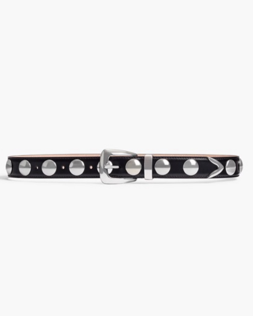 Black leather with silver hardware. Size 75 fits xs/s. Love this belt adds such a cool touch to any outfit