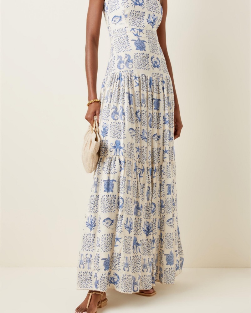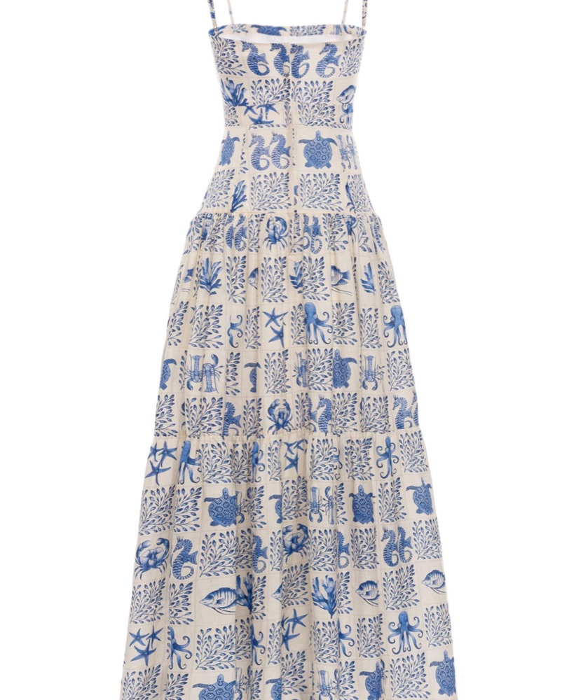 Stunning and breezy Agua by Agua Bendita Lima maxi dress featuring a feminine tiered silhouette and delicate blue-and-white print. Crafted from lightweight linen, this elegant dress is perfect for summer events, resort wear, or vacation evenings. Effortlessly chic and timeless.
