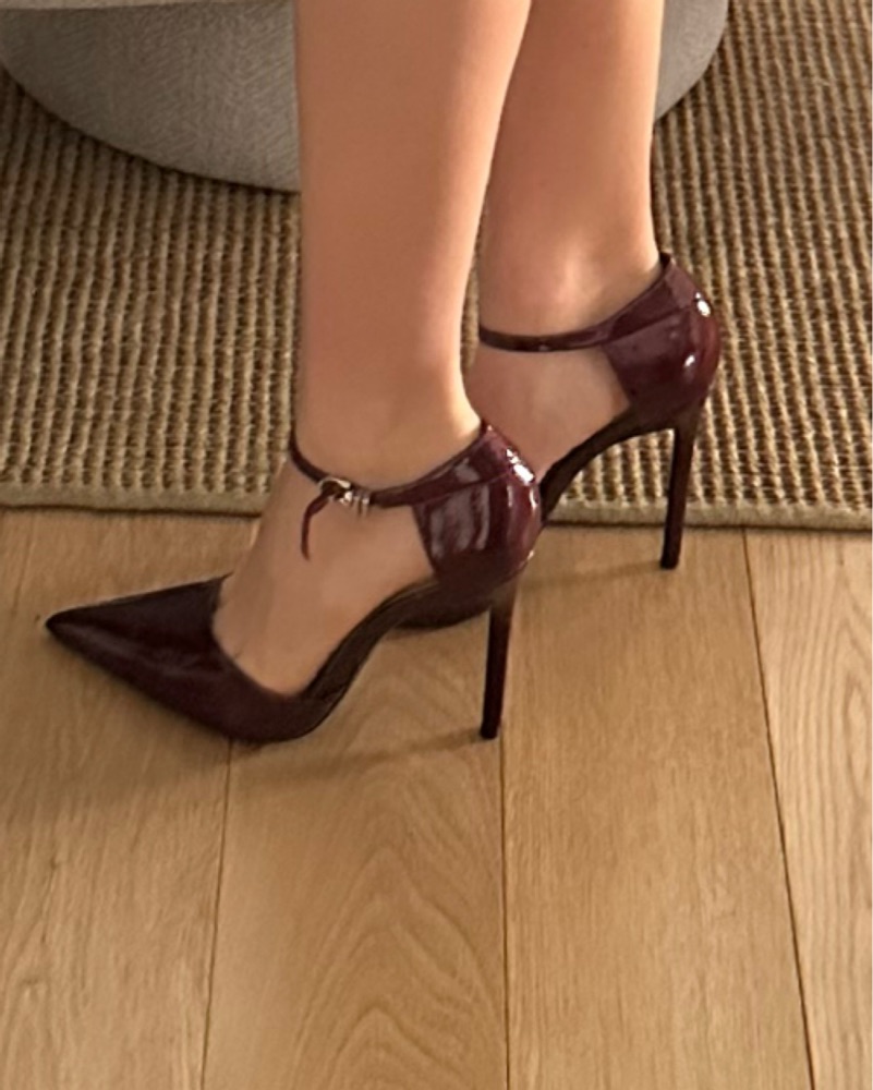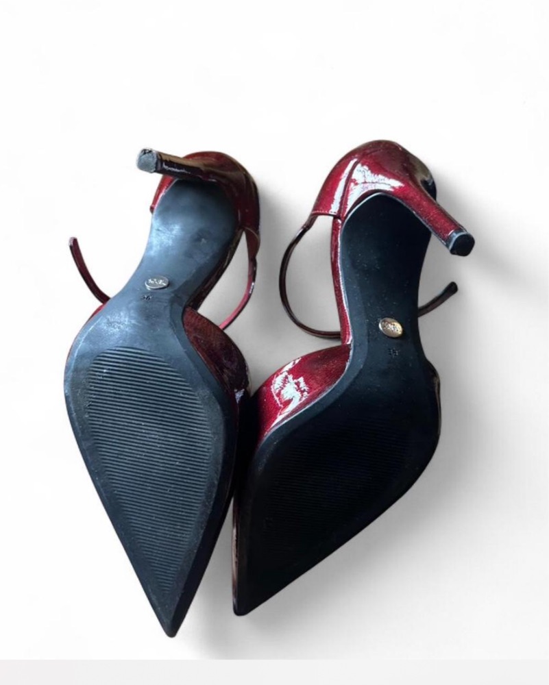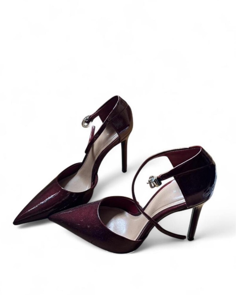 Super sexy maroon/burgundy patent leather pump heels with an ankle strap, women’s size 8. Such a cool statement heel