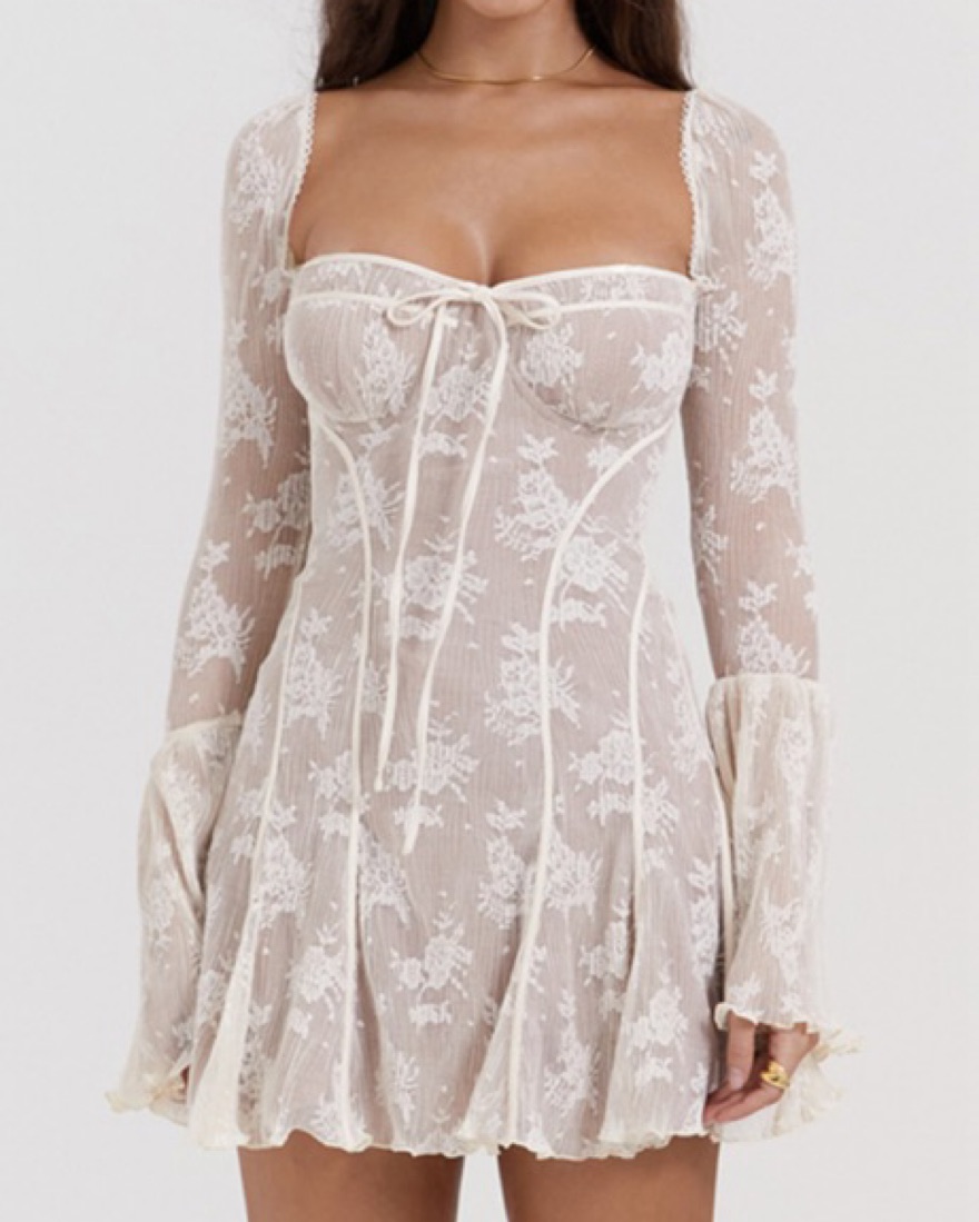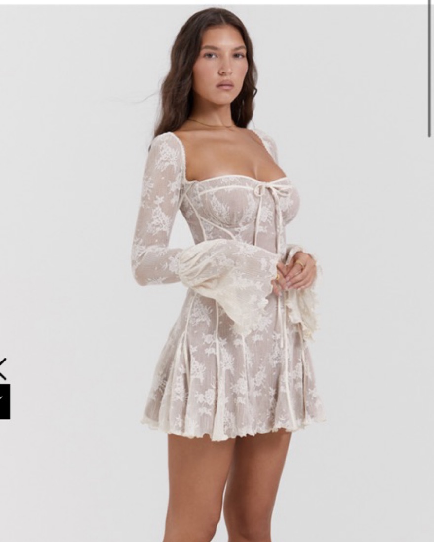 House of CB Analissa dress in the color vintage cream lace! Analissa' is made from a pretty dotted lace with delicate satin trims and underpinned with our figure cinching power mesh lining for coverage. It has underwired cups, topped with a sweetheart neckline. SIZE M, cup size a-c, reg length.