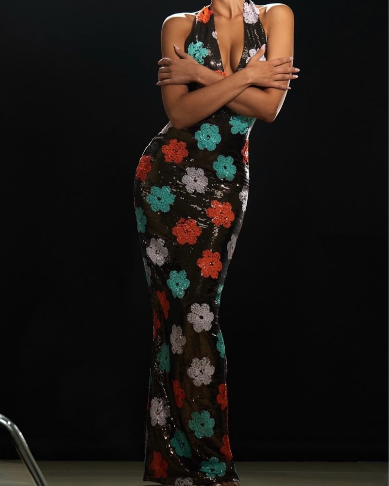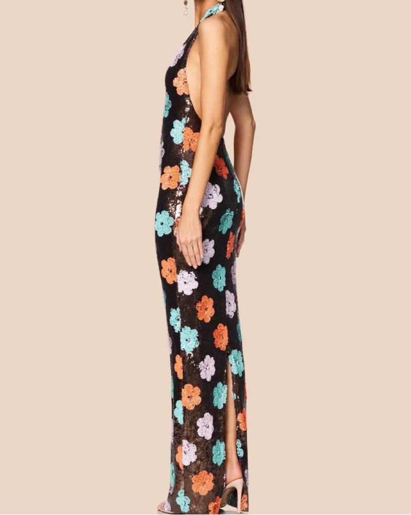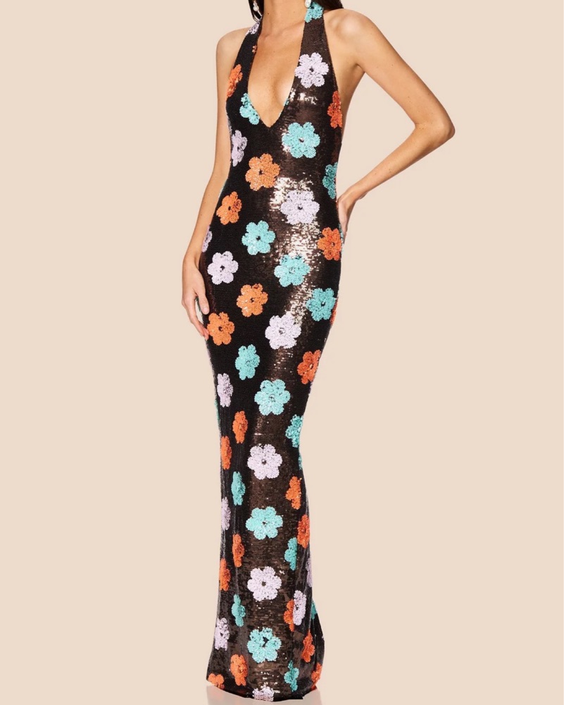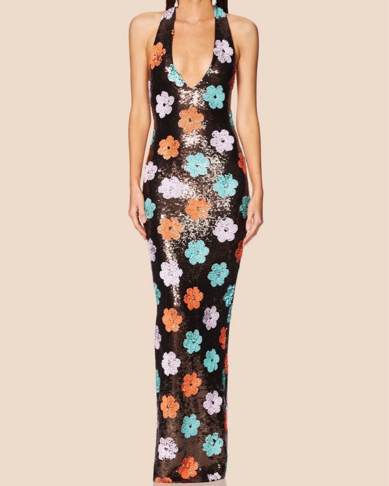 Vibrant Floral Sequin Halter Gown by Nookie - Pickle