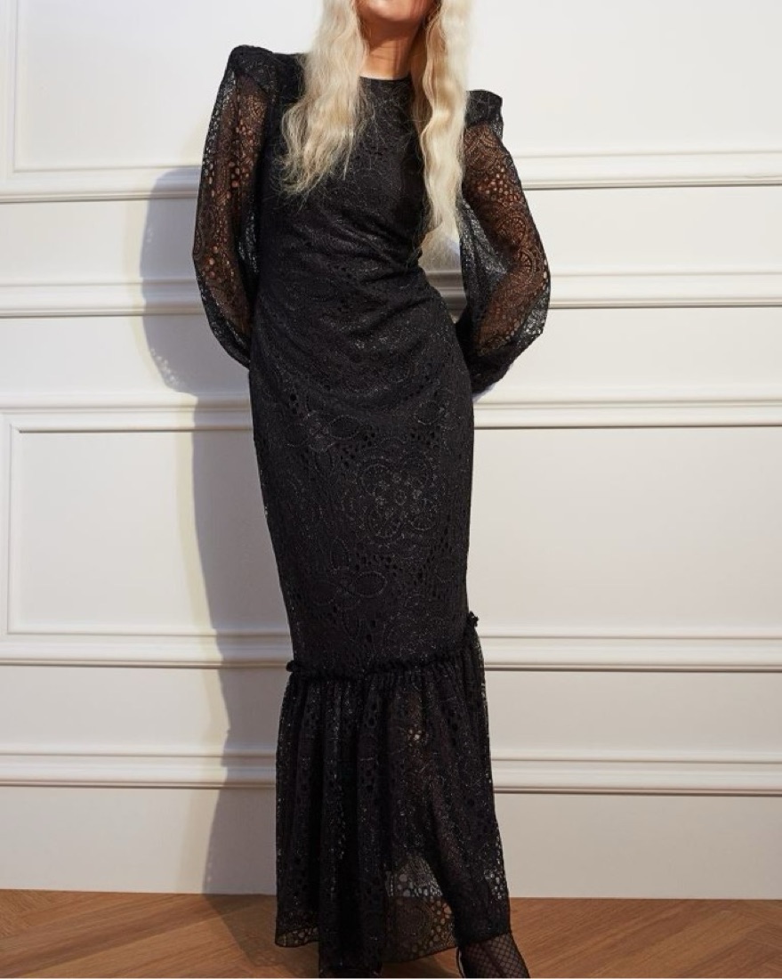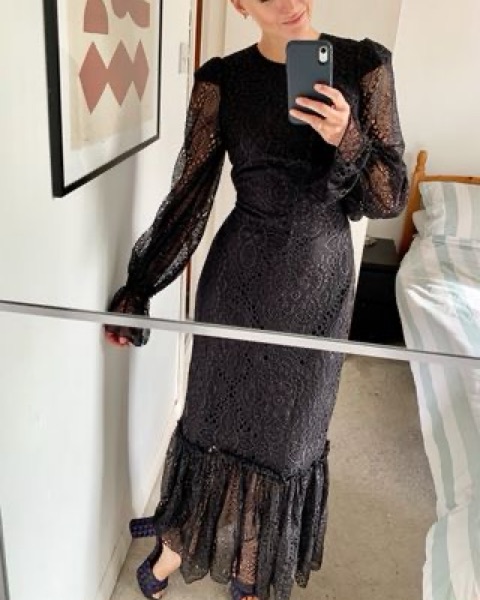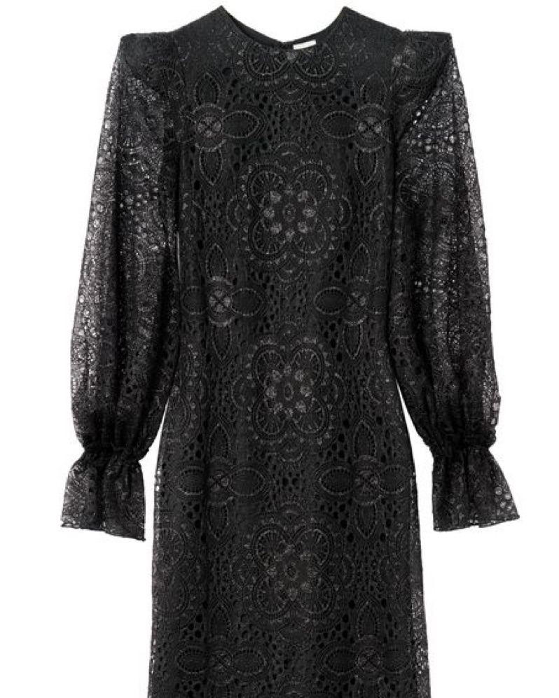 A fave from the h&m collab for vampires wife. Such a fun dress to wear - can dress it up for winter parties or down with a chunky boot! Lined on the body, but the sleeves are open. Has a light shimmer to the lace, but not too sparkly.