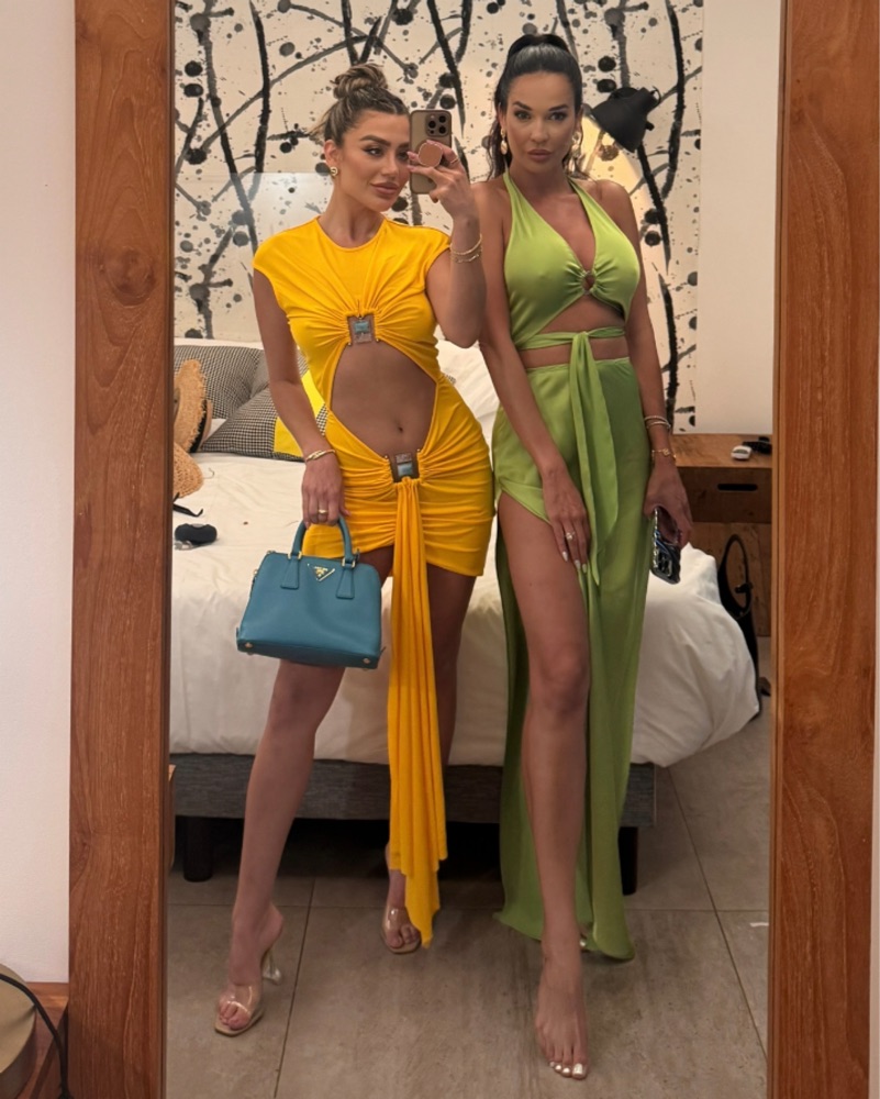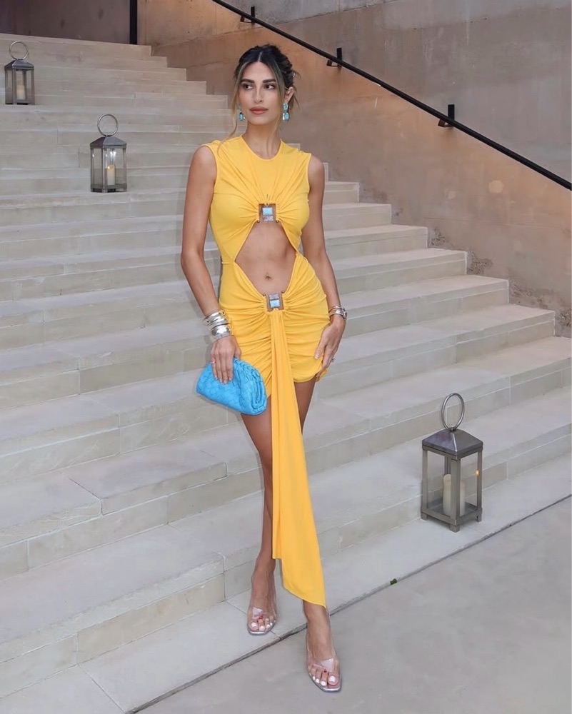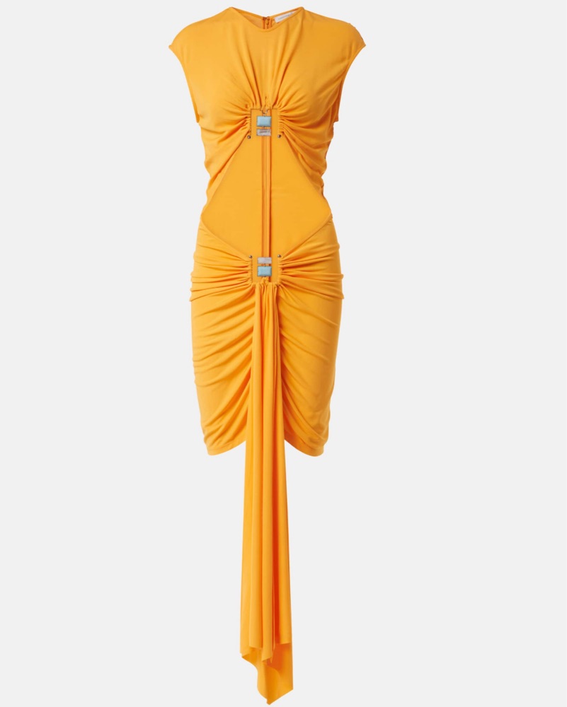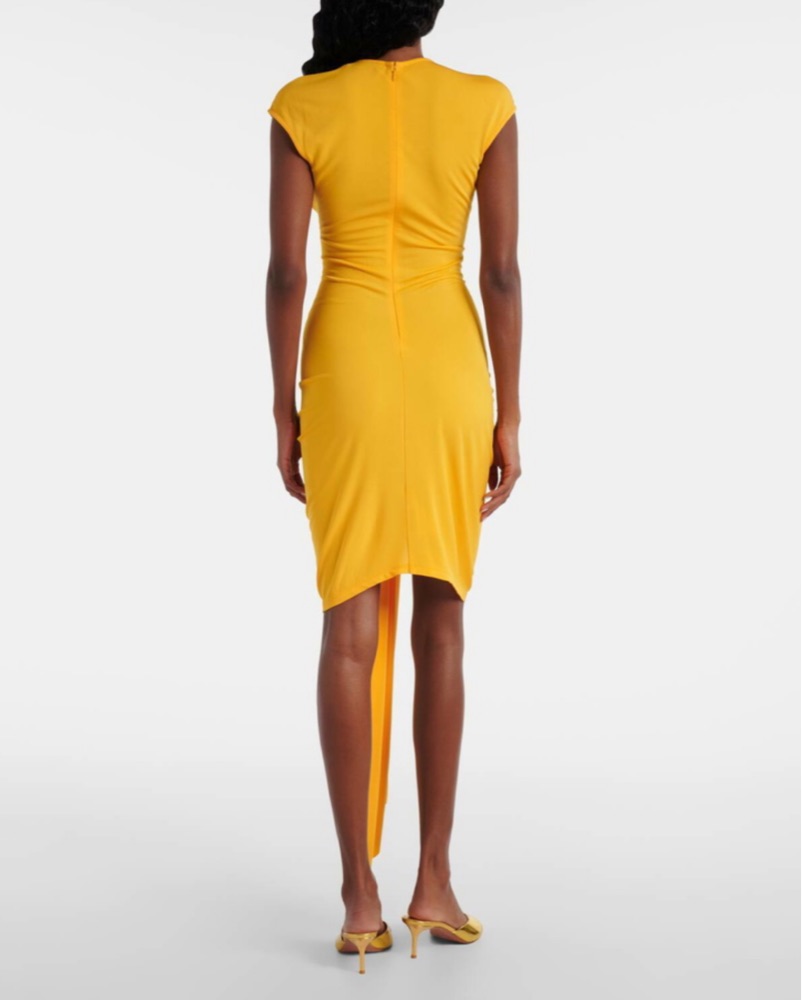 CHRISTOPHER ESBER- Duo Bezel cutout jersey minidress in mustard yellow with turquoise stone details