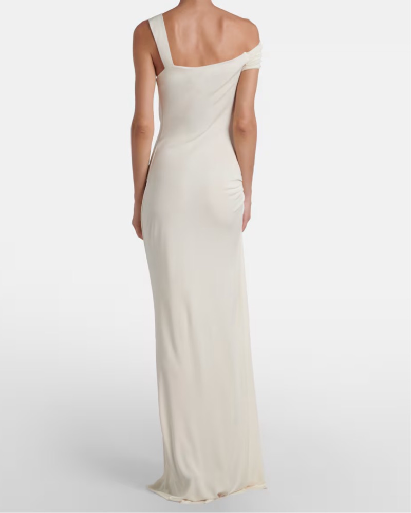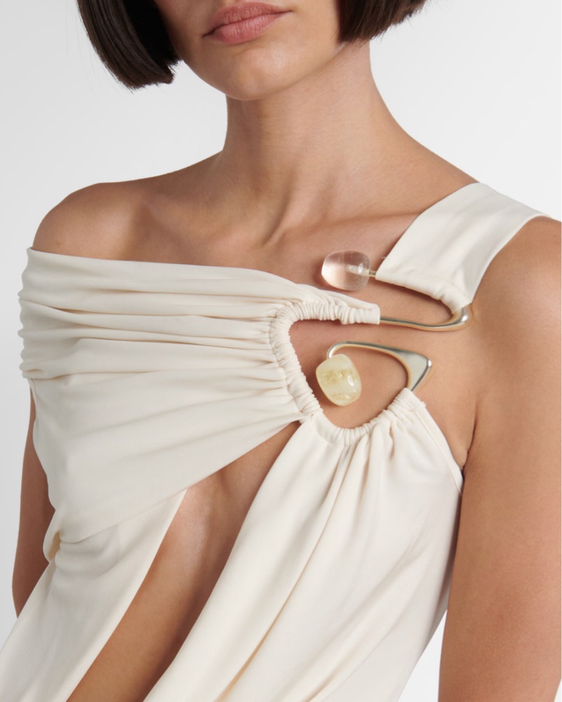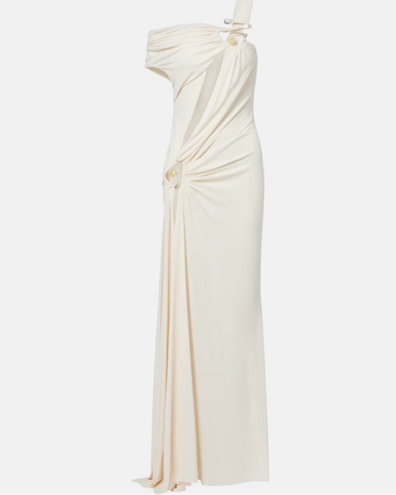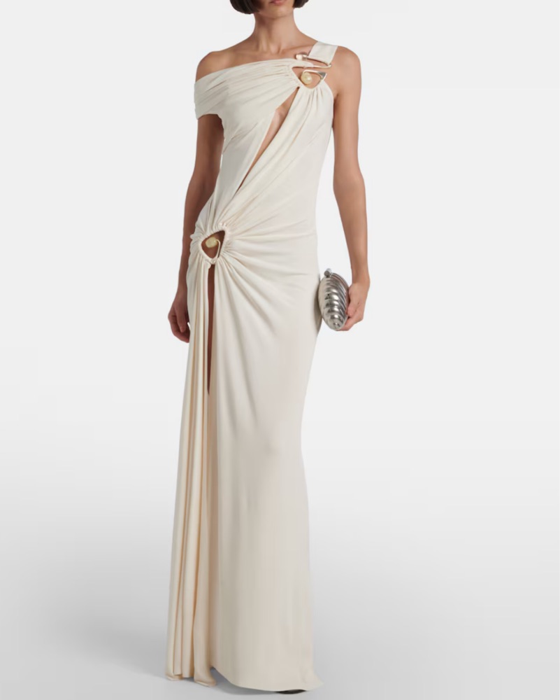 Christopher Esber's sensual cuts & sculptural hardware on display. This maxi dress is made from draped jersey. Great for bridal, beach vacations, engagement. Please note: there are some small blemishes on this dress, small & difficult to see when wearing & is reflected in rental price