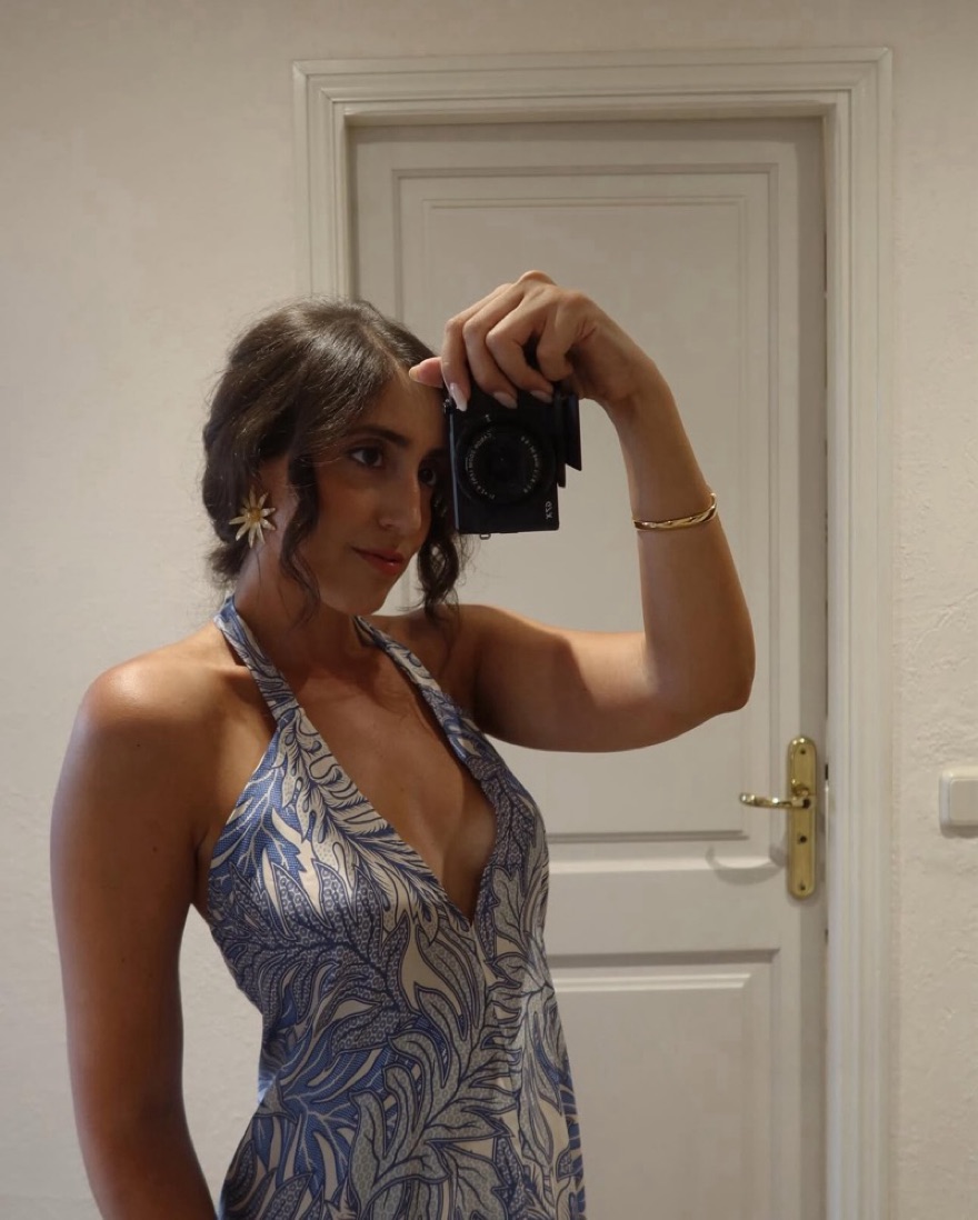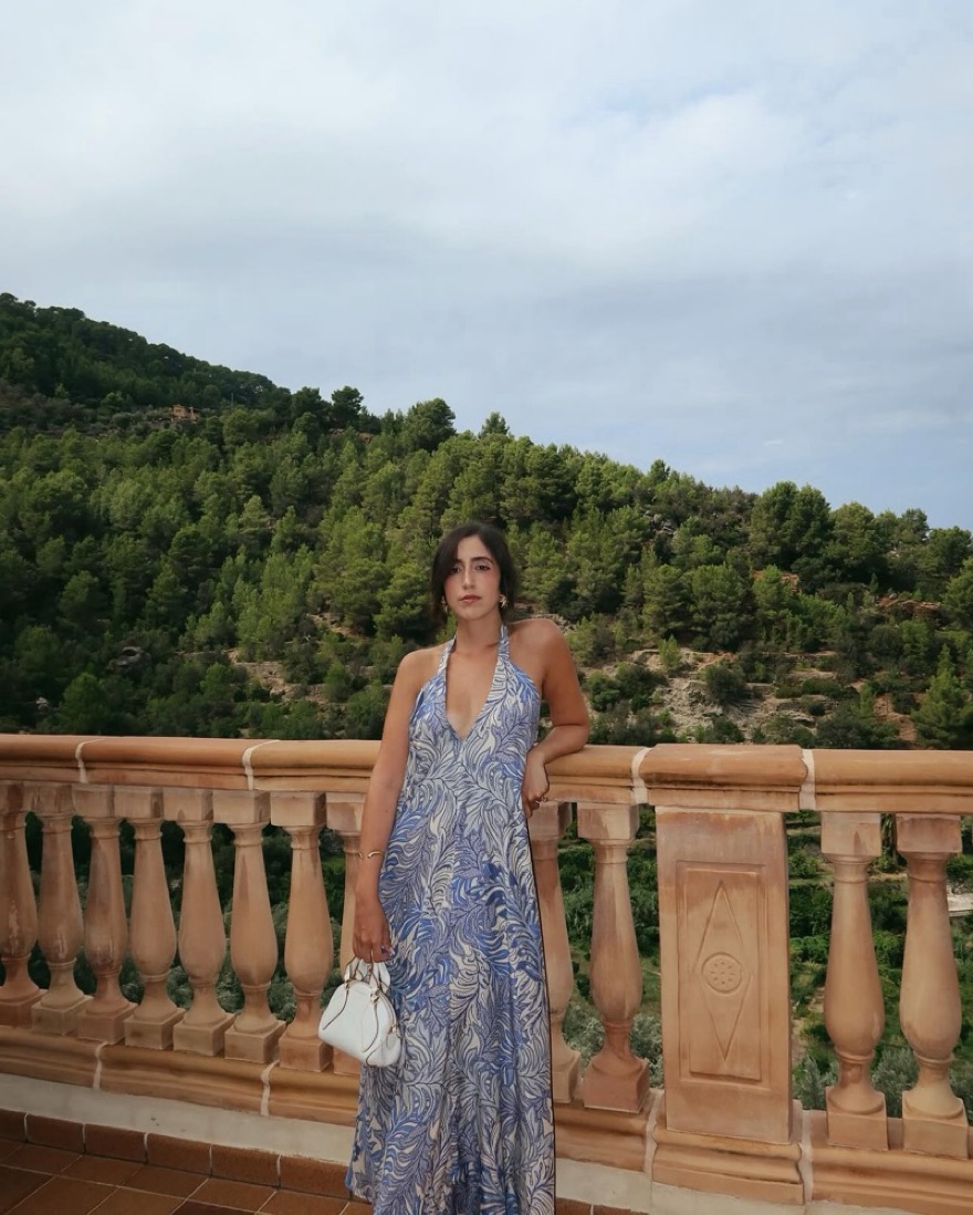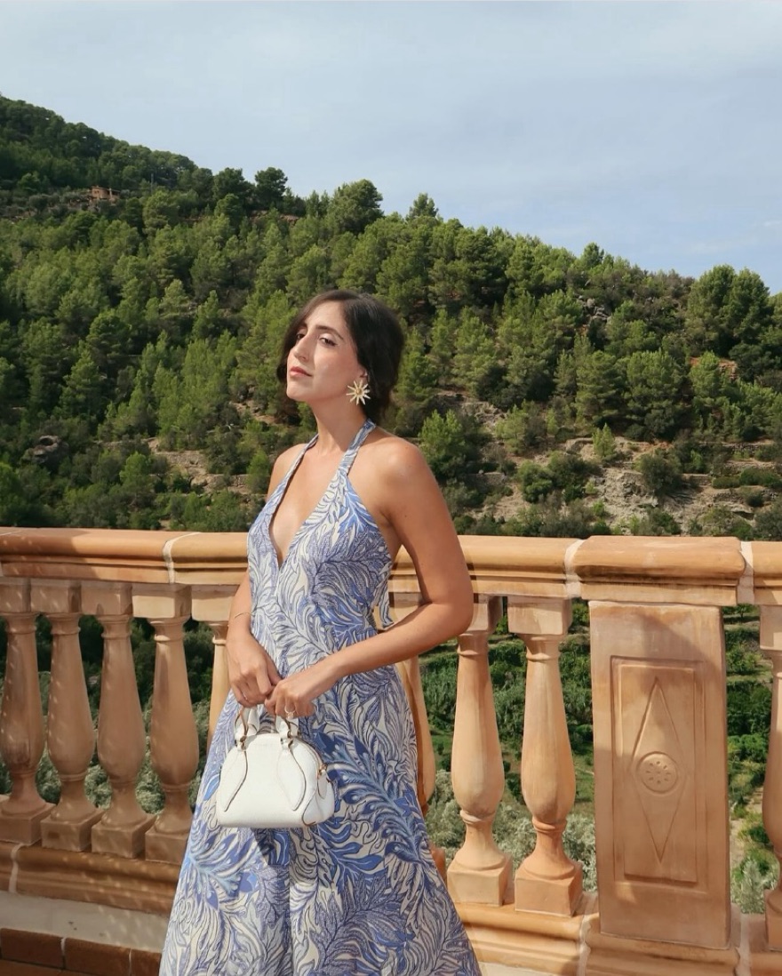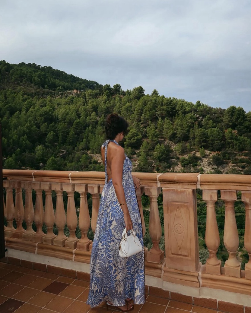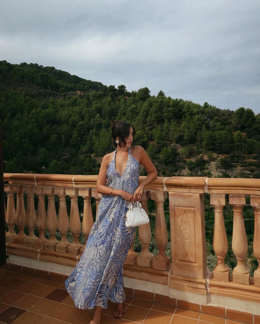 Open back silk halter dress in blue and ivory print, 100% silk