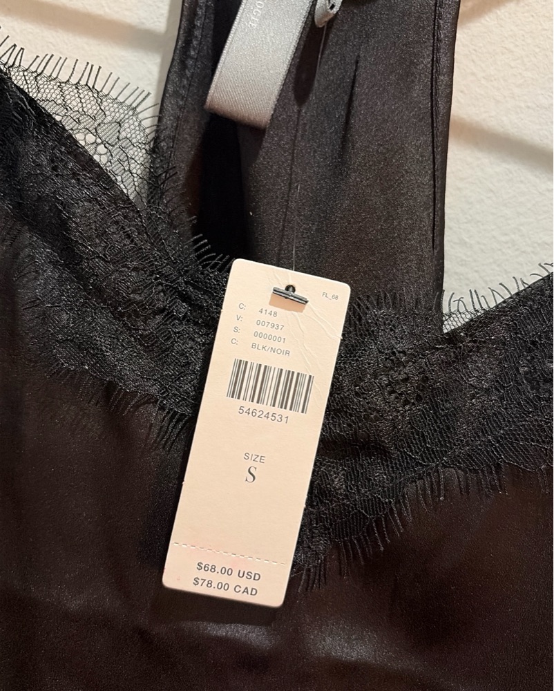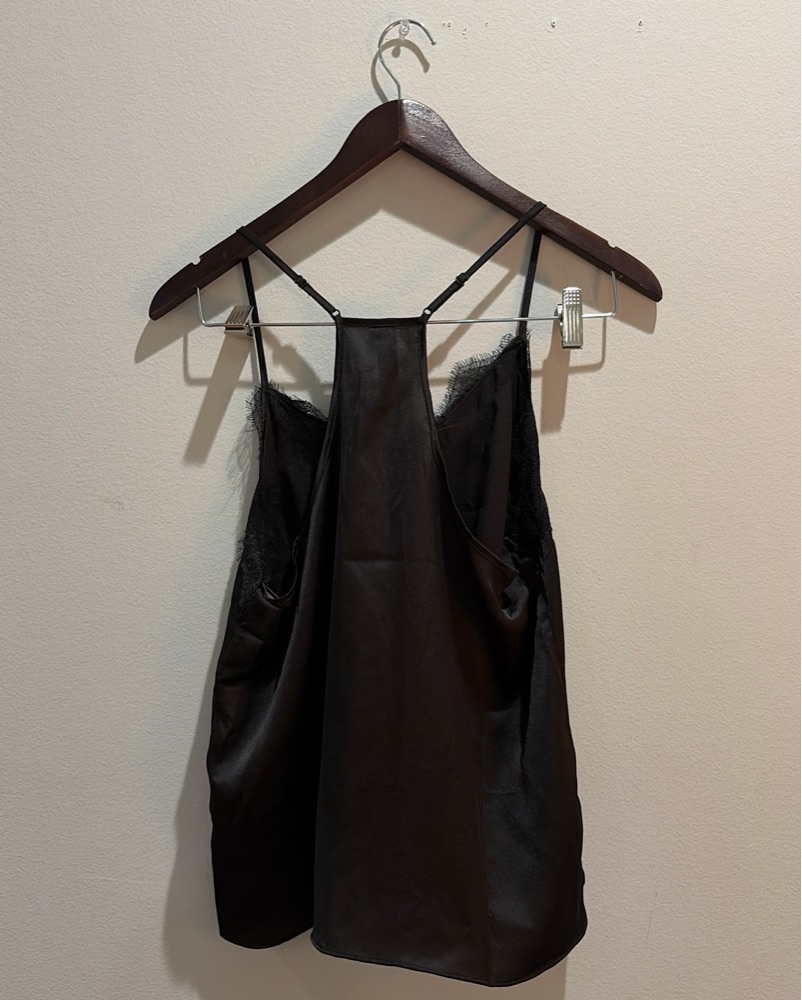 This chic black lace top is perfect for a night out. The luxurious lace details and spaghetti straps create a sophisticated and alluring look.