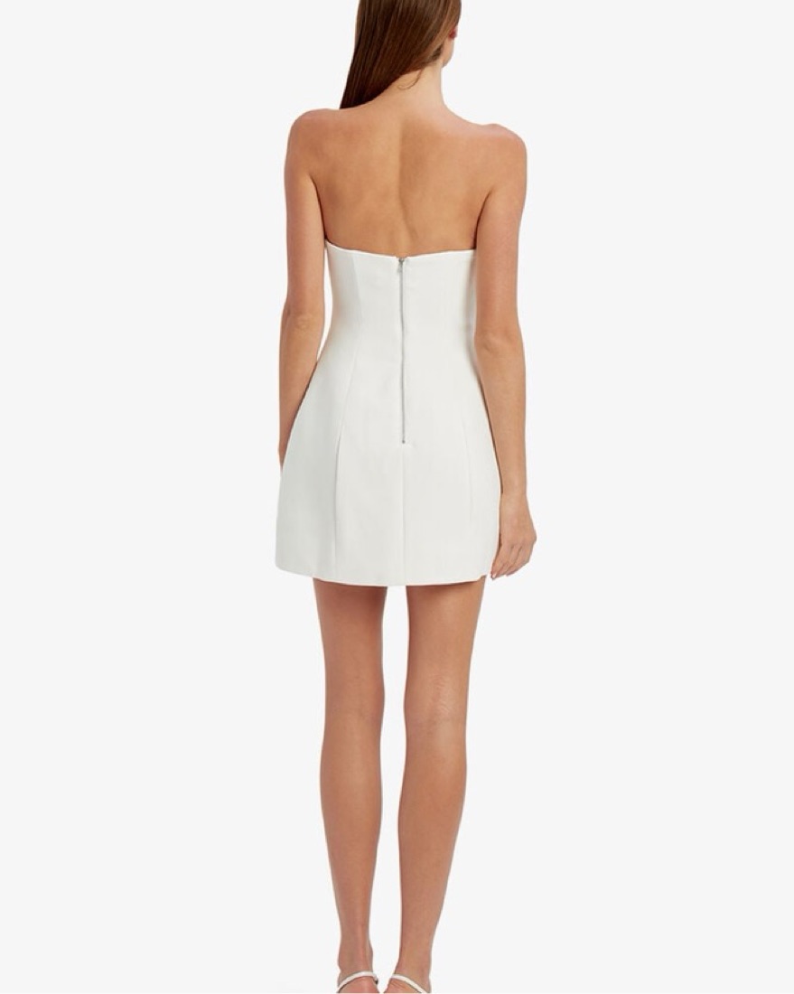 This chic white mini dress is the perfect choice for a night out. Its strapless design and structured silhouette create a flattering and sophisticated look.