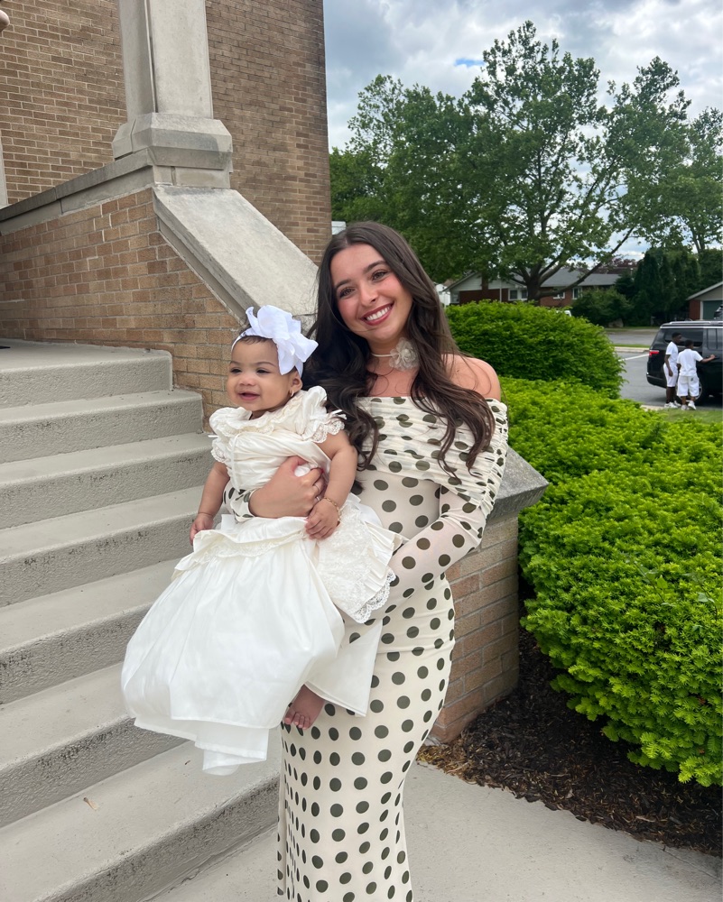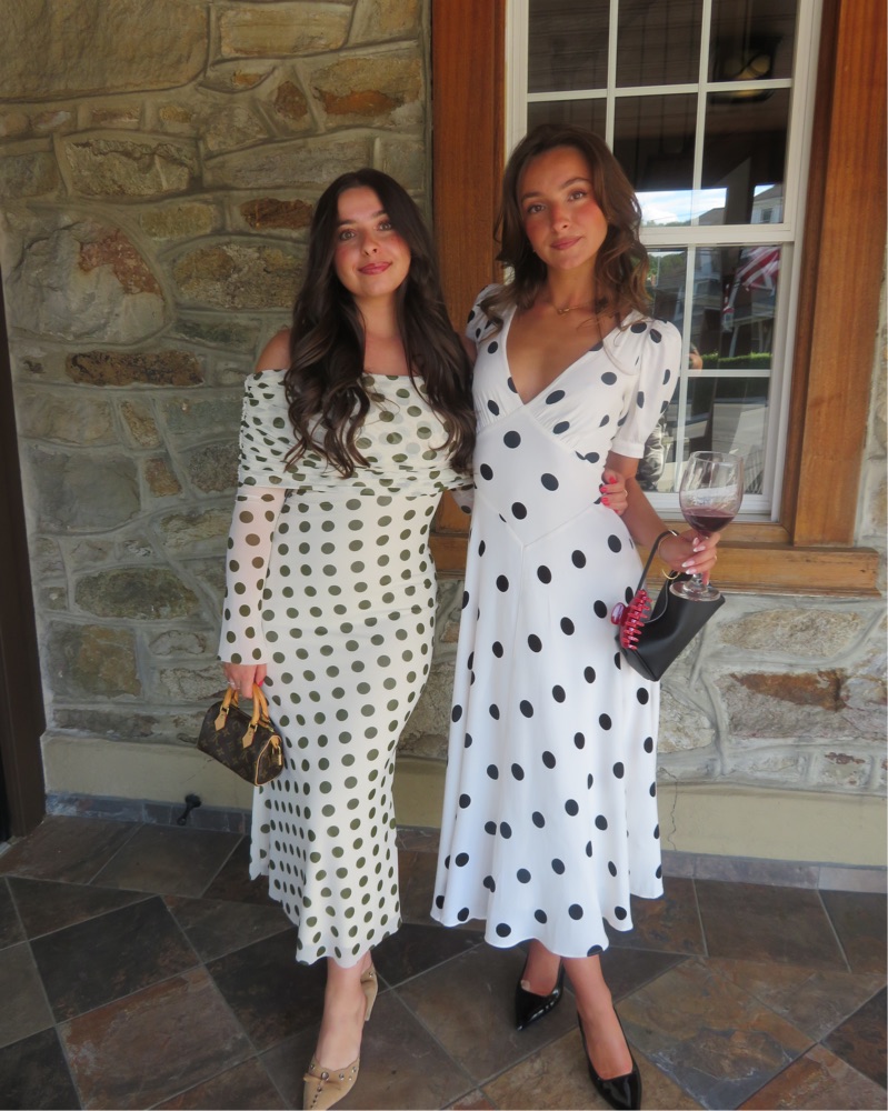 Maxi Off The Shoulder Affrm Polka Dot Dress in green and ivory. Stretchy material