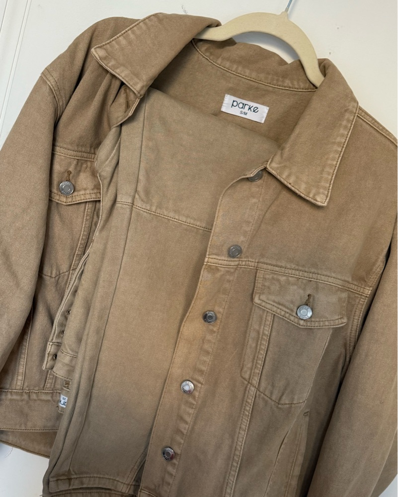 Denim Jacket is XS/S and Barrel Jeans is 25. For sizing, I wear a true 27 in my jeans but these fit perfectly with being a tad oversized.