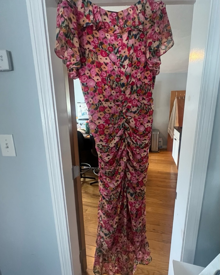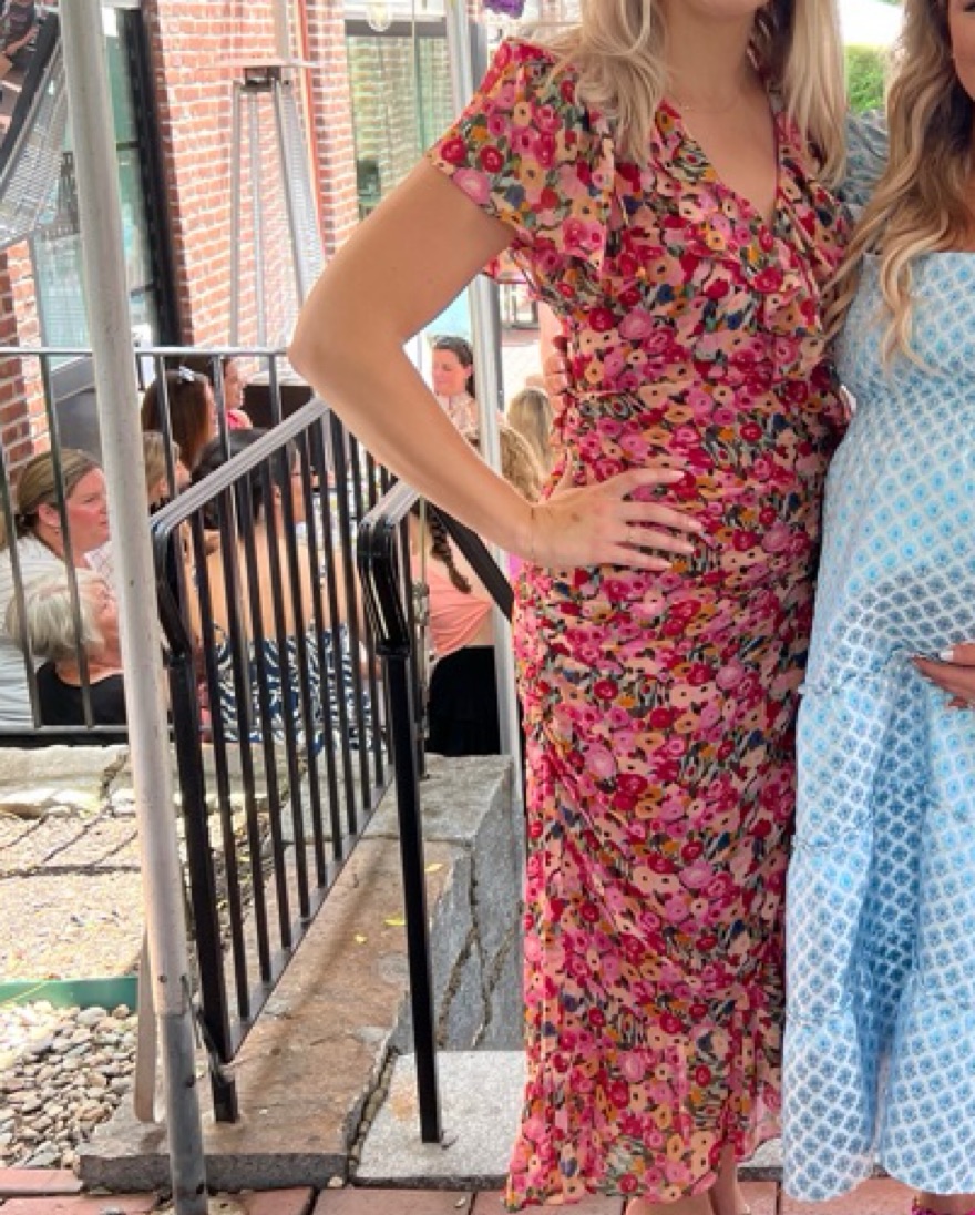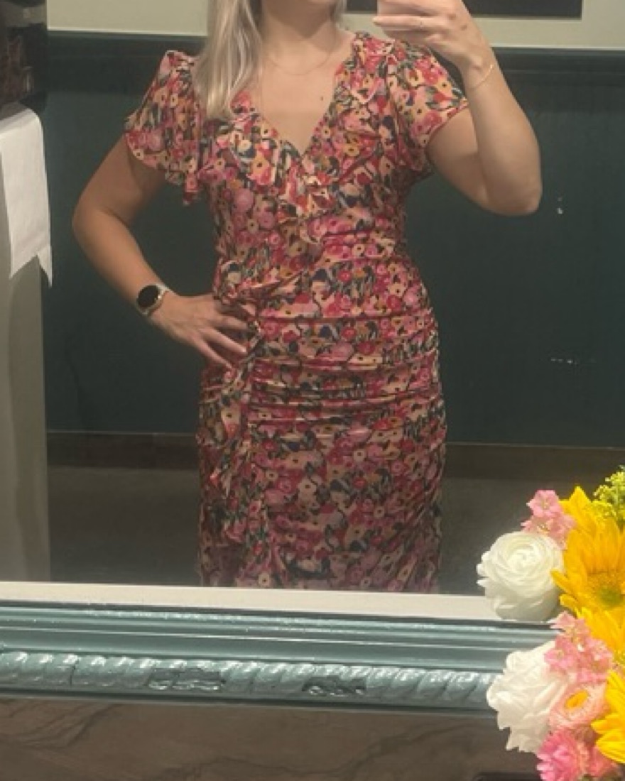 Worn once for a couple of hours to a baby shower. Nearly new condition. Ruching in the lower half and flutter sleeves
