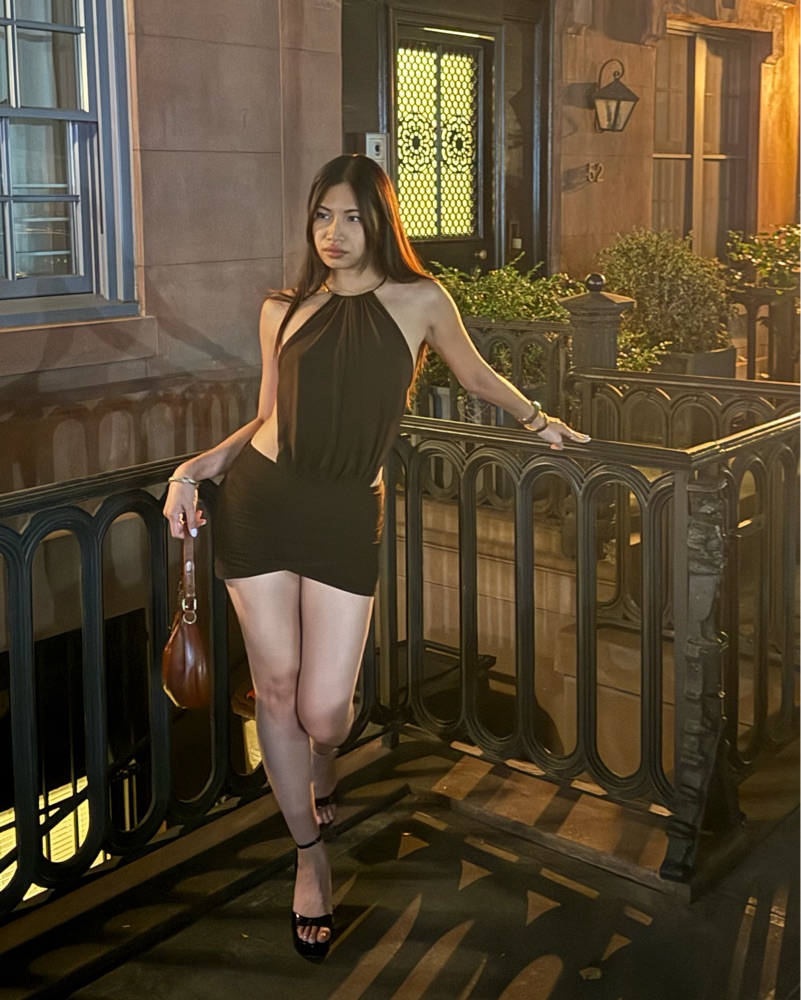 This sexy mini dress is perfect for a night out! The back ties with a string and the bottom is very stretchy! The part that goes around your neck is a gold metal piece that clips from behind! Size Small!
