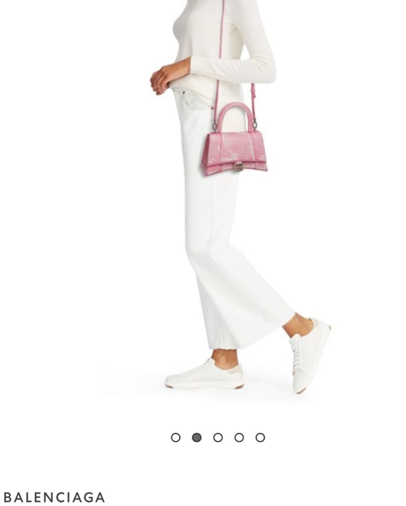 This bold and stylish leather satchel from Balenciaga is a chic accessory that can elevate any outfit. Its structured hourglass shape and eye-catching print make it a statement piece perfect for a night out or special occasion.