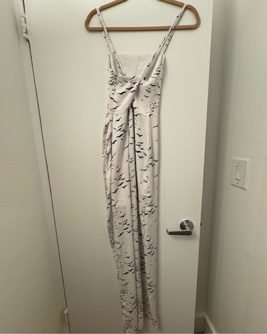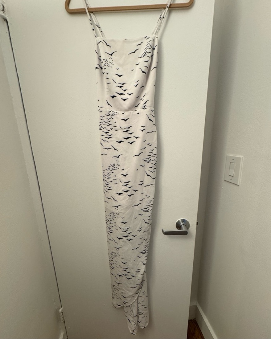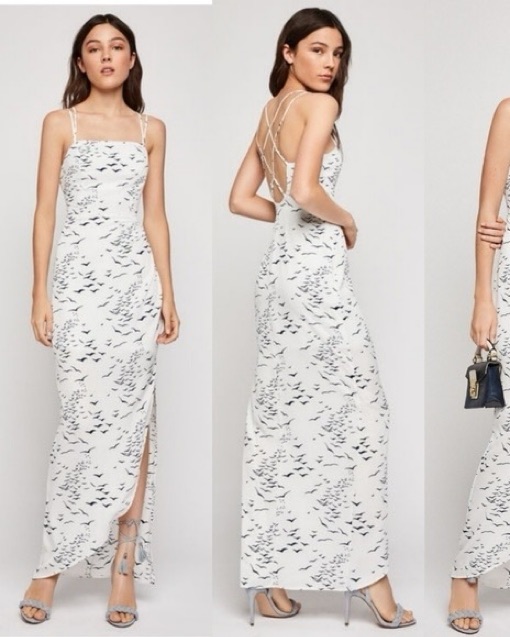 This stunning maxi dress features a captivating fluttering print that will make you the center of attention at any event.