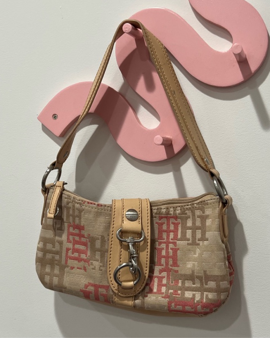 Vintage Tommy Hilfiger Shoulder Bag. Pink, cream, brown, tan