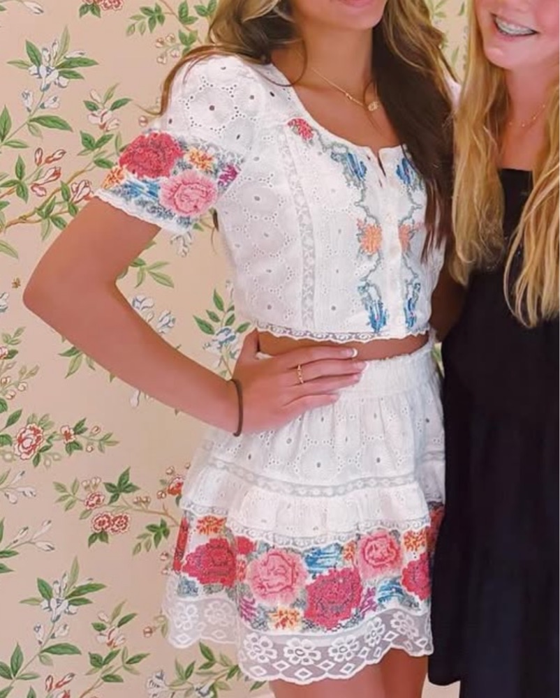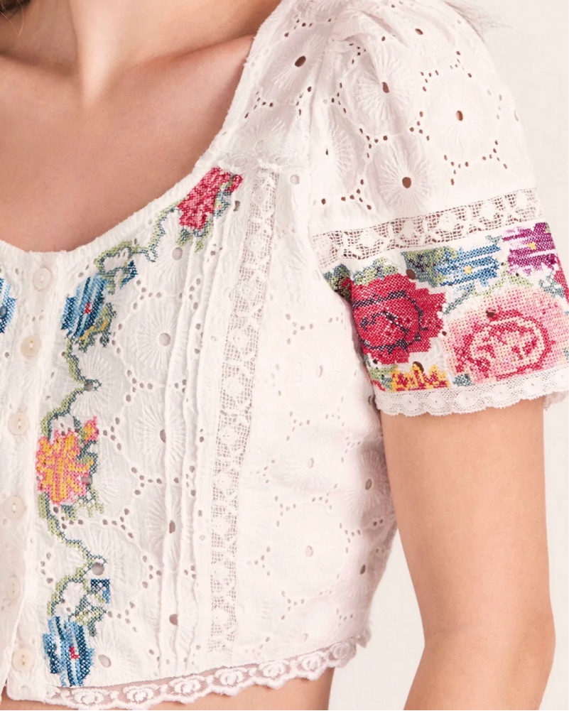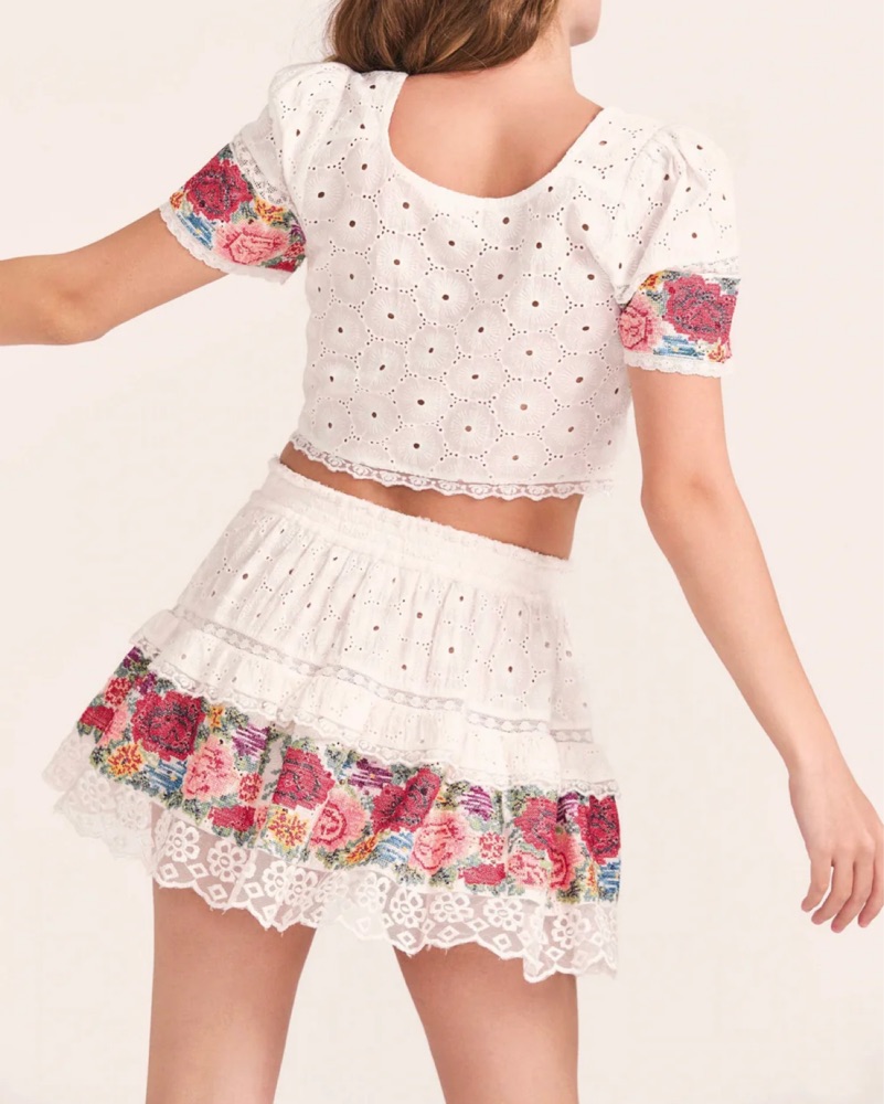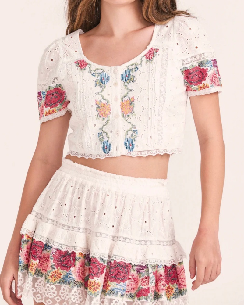 100% cotton eyelet with needlepoint cross-stitch details and mixed custom lace panels! Love love love this set🩷 the top retails for 325 and the skirt 345! Message me to rent separately!