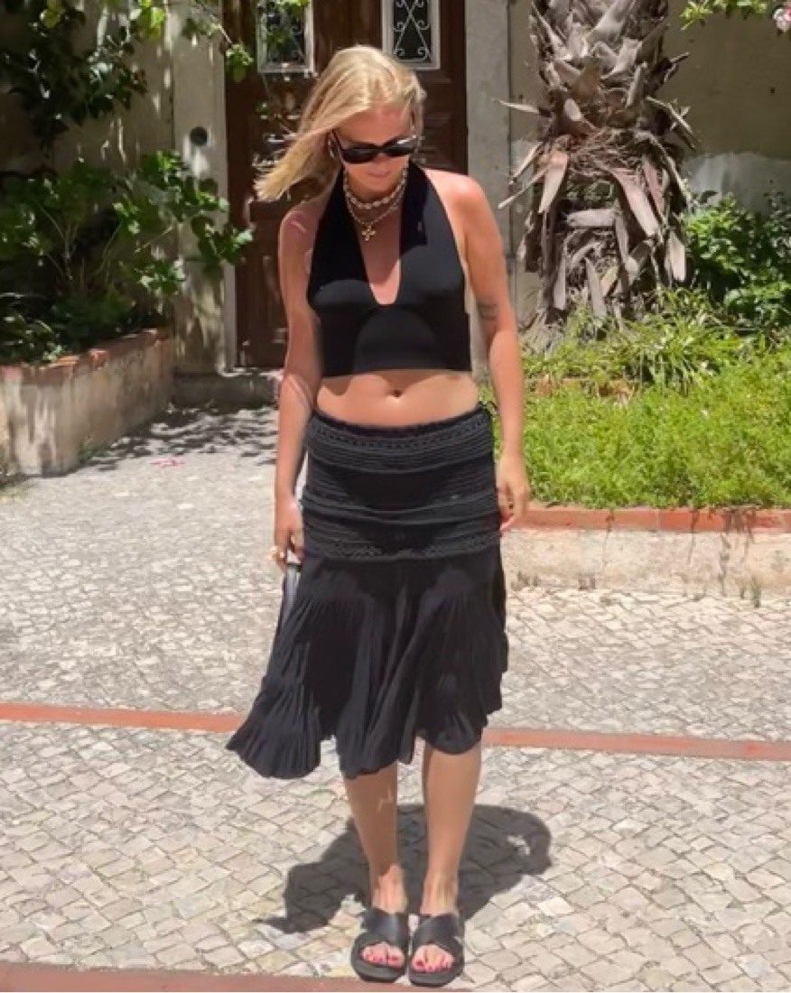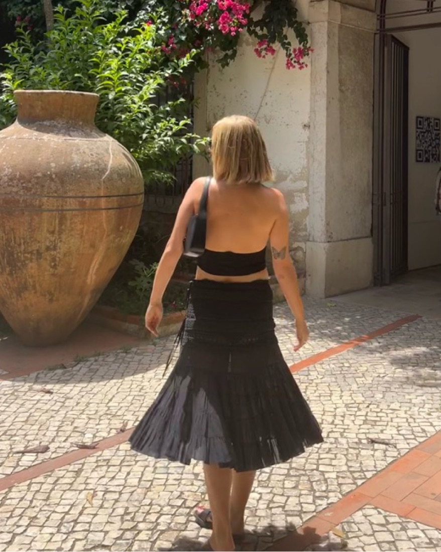 Vintage black bulmarine skirt with crochet details. The tie at the top is adjustable so the fit is a little big but i just tied it tighter. Im a size 2/4 and wore it low waisted and it was perfect. Slughtly sheer but with black underwear it’s unnoticeable.